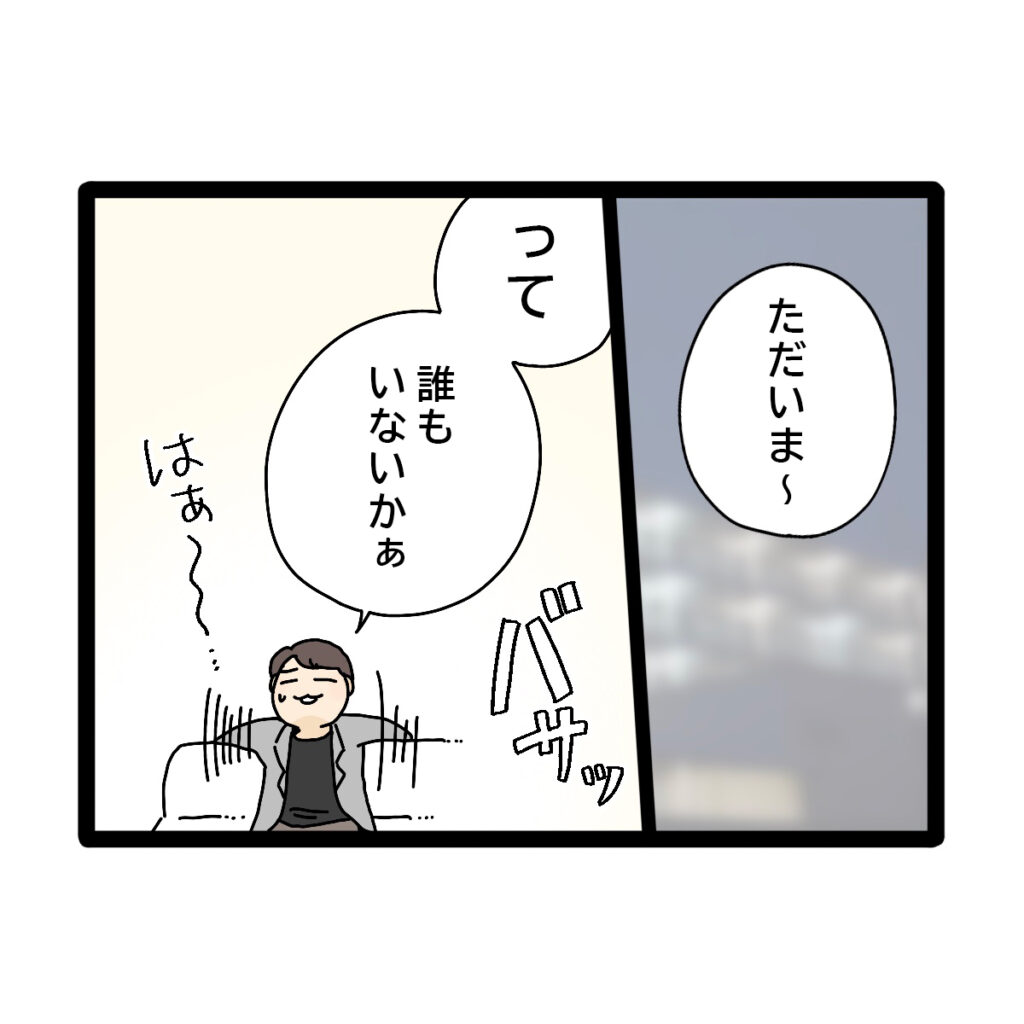 仕事から「ただいま~」と帰宅した夫のコウタさん。静まり返った部屋でソファーに勢いよく座りながら「って誰もいないか~」とため息をつきます。