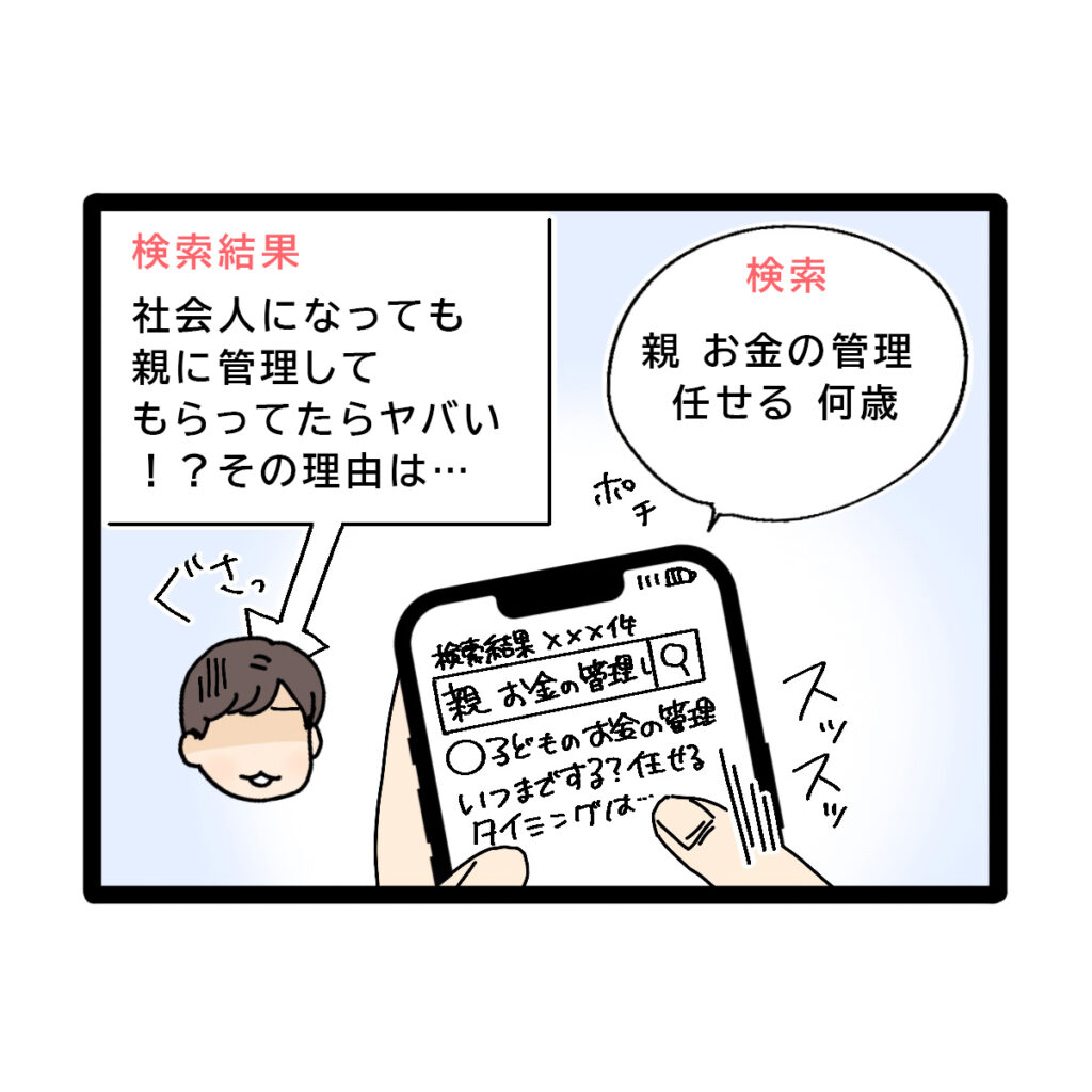 同僚たちの話を聞いて気になったコウタさんはネットで『親 お金の管理 任せる 何歳』と検索してみました。すると『社会人になっても親に管理してもらっていたらヤバい?その理由は・・・』など同僚たちが話していたようなことが書かれた記事がずらりと出てきました。