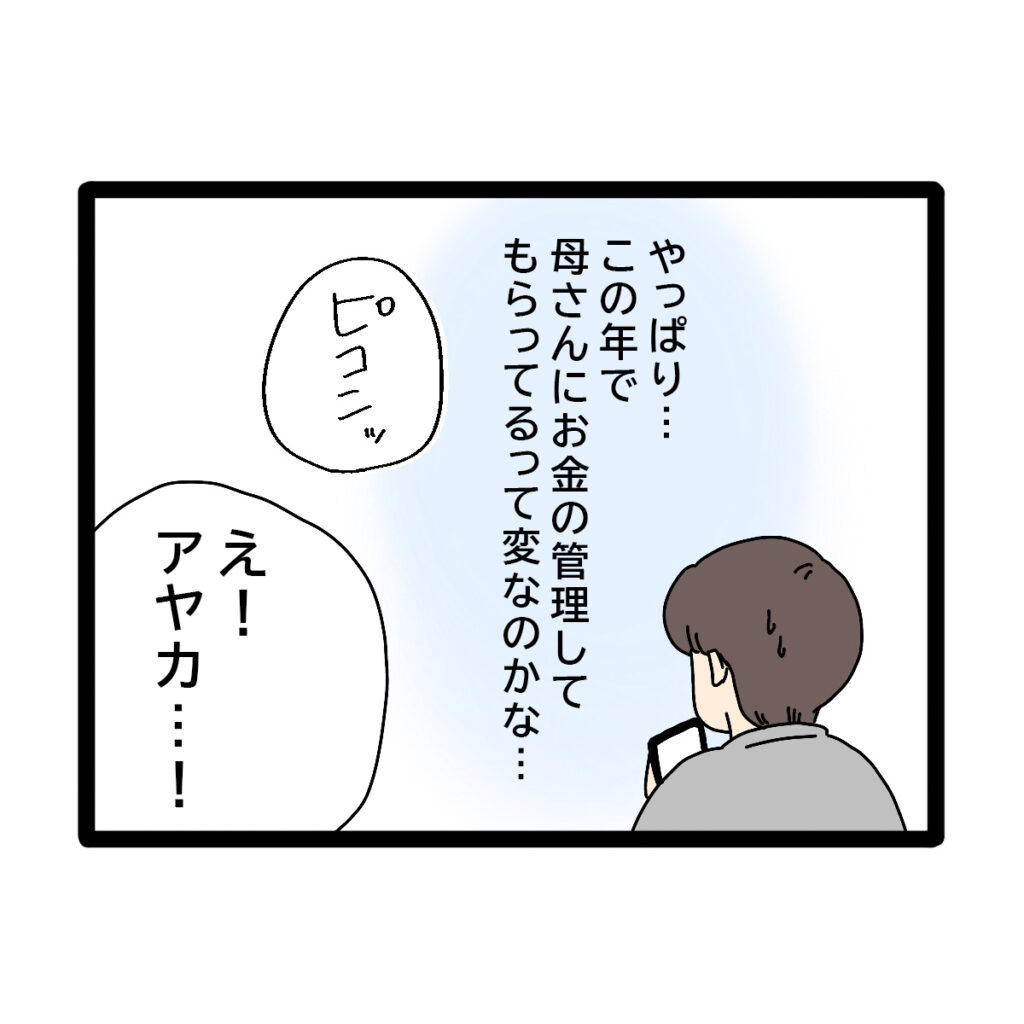 世間とのズレを感じたコウタさんは「やっぱり・・・この歳で母さんにお金の管理してもらってるのって変なのかな・・・」と心の中で思っていました。