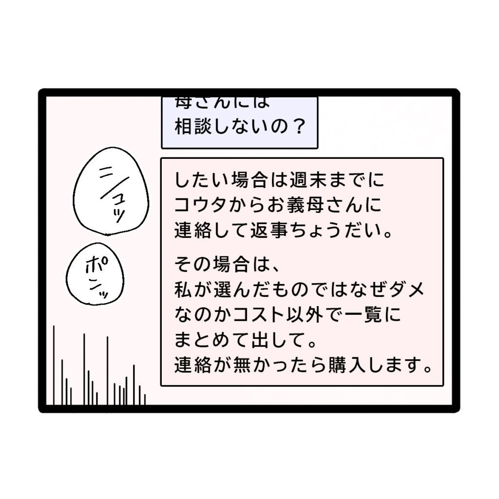 すると『したい場合は来週までにコウタからお義母さんに返事してちょうだい。その場合は、私が選んだものではなぜダメなのかコスト以外で一覧にまとめて出して。連絡が無かったら購入します。』とすぐに返事がきました。