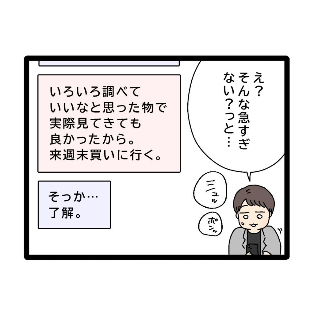 しばらくして『いろいろ調べていいなと思った物で実際見てきても良かったから。来週末買いに行く。』とアヤカさんから返事がきて、コウタさんは『そっか・・・了解』と返信をしました。