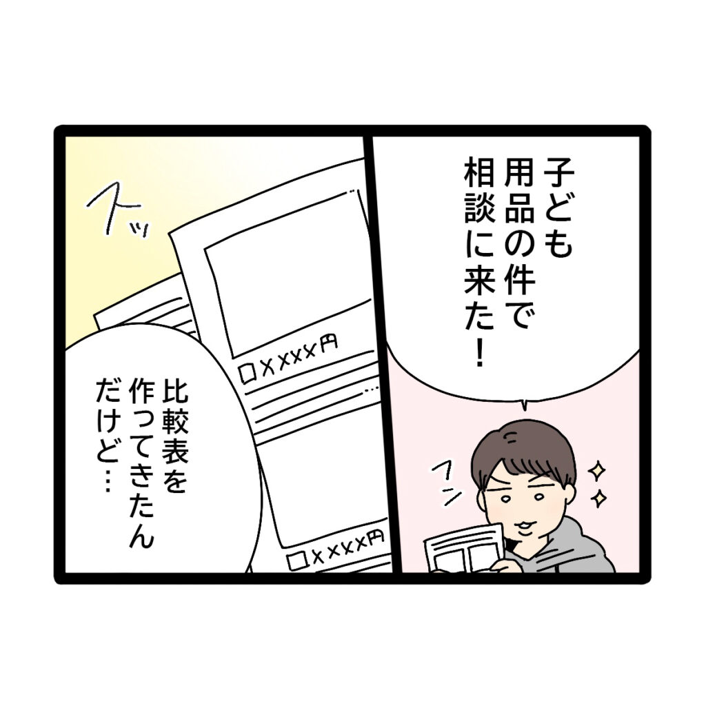 コウタさんは「子ども用品の件で相談に来た!」と昨日作った資料を自信満々に義母に見せました。