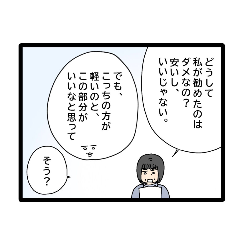 コウタさんはすかさず「でも、こっちの方が軽いのと、この部分がいいなと思って。」と資料を見せながら説明しましたが「そう?」と納得いかない様子。