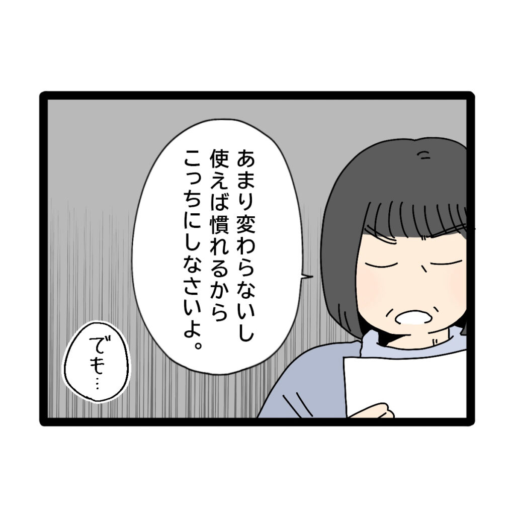 義母はコウタさんの意見も無視して「あまり変わらないし使えれば慣れるからこっちにしなさいよ。」と自分の選んだものを買うように言いました。