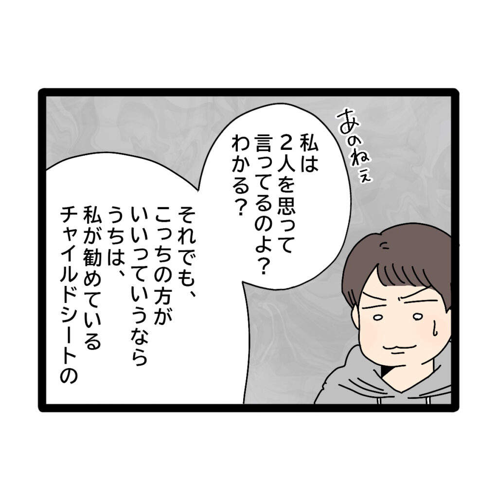 義母は続けて「あのねぇ、私は2人を思って言ってるのよ?わかる?それでもこっちの方がいいっていうならうちは、私が勧めていいるチャイルドシートの・・・」