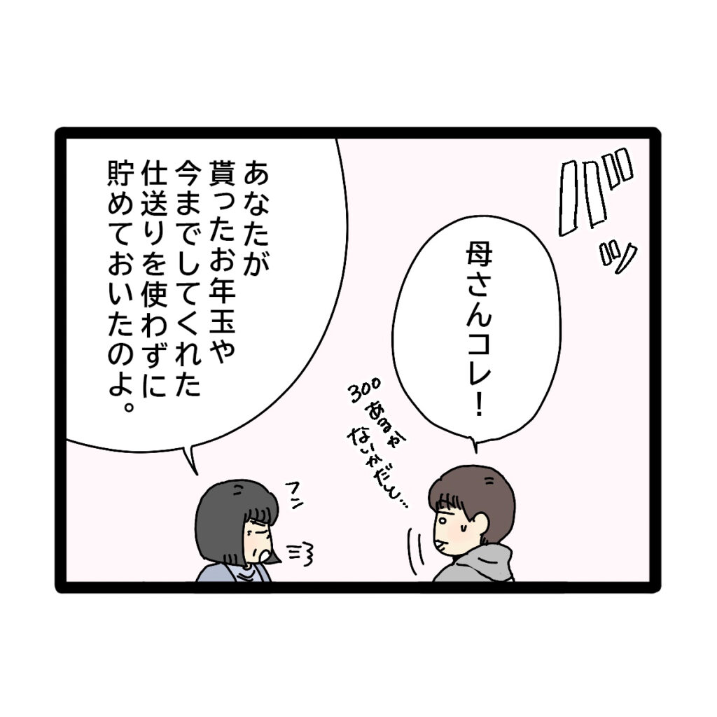 コウタさんは、仕送りまで貯金していてくれたと知り「・・・母さん。」と目を潤ませたのでした。