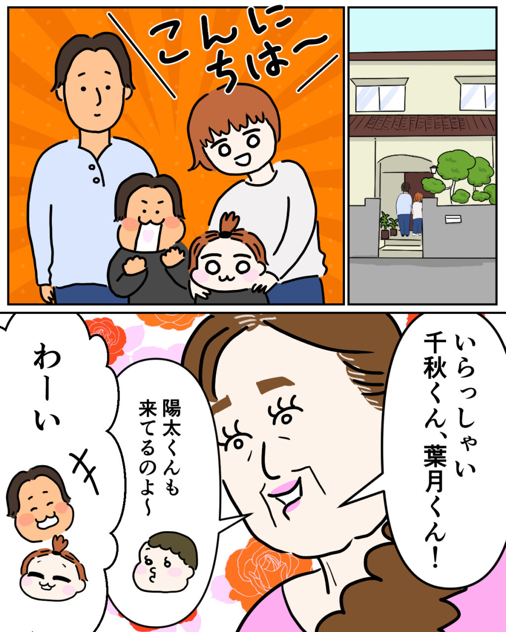 私たちは、週末に家族で義実家を訪れました。「こんにちは~!」と子どもたちが元気よく挨拶すると、「いらっしゃい、千秋くん、葉月くん!」と義母が笑顔で迎えてくれます。従兄弟の陽太くんも来ていると聞きいた子どもたちは、「わーい」と大喜びで家の中へ駆け込んでいきました。