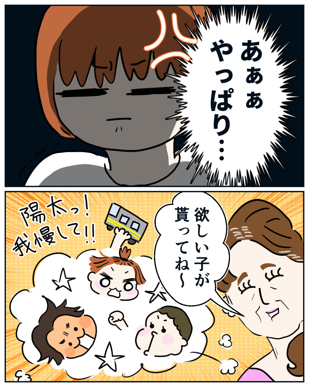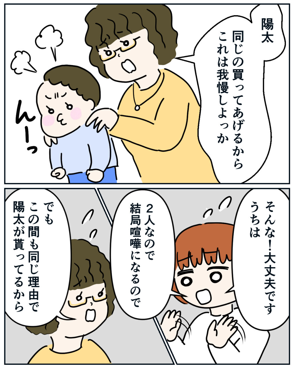 すると、義兄嫁のしのぶさんが、「陽太、同じの買ってあげるからこれは我慢しよっか」と声をかけます。だけど陽太くんは不満そう。私はしのぶさんに「そんな!大丈夫ですうちは・・・2人なので結局喧嘩になるので」と遠慮します。けれど、しのぶさんも「でもこの間も同じ理由で陽太が貰ってるから」と同じように遠慮して埒が明きません。