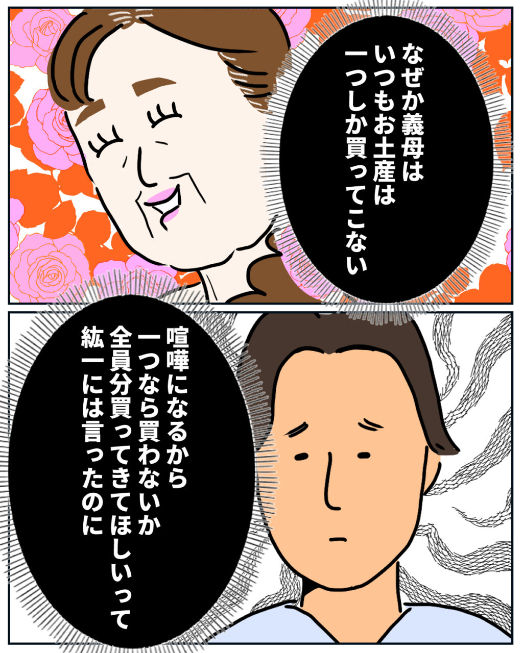 なぜか義母は、いつもお土産を1つしか買ってきません。紘一には「ケンカになるから、1つだけなら買わないか、全員分買ってきてほしいと」と伝えてありますし、きっと義母にも話してくれているはず。それでも、何度言ってもお土産は1つだけ。そのたびに、どうしたらいいのかと困ってしまうのです。