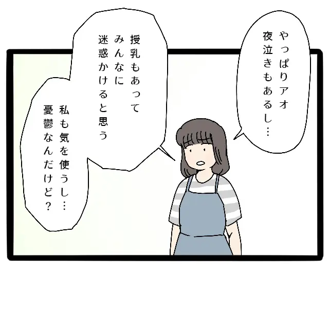 「やっぱりアオ、夜泣きもあるし・・授乳もあってみんなに迷惑かけると思う。私も気を遣うし・・憂鬱なんだけど?」とコウタに言うと、