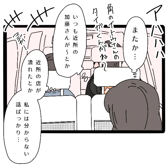「アハハハ!角のイトウさんのタイガくんがね~」「マジかー」と話が尽きないコウタと義母。私は「またか・・いつも近所の加藤さんが~とか、近所の店が潰れたとか、私には分からない話ばっかり・・」と心の中で呟きました。