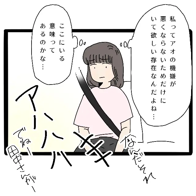 そして、一番後ろの狭いシートに座りながら、「私って、アオの機嫌が悪くならないためだけにいて欲しい存在なんだよね・・ここにいる意味ってあるのかな・・」と呆然と考えていると、「アハハハ!でねー田中さんがー」「なんだそれ(笑)」とまだまだ私の知らないご近所話が続いていました。