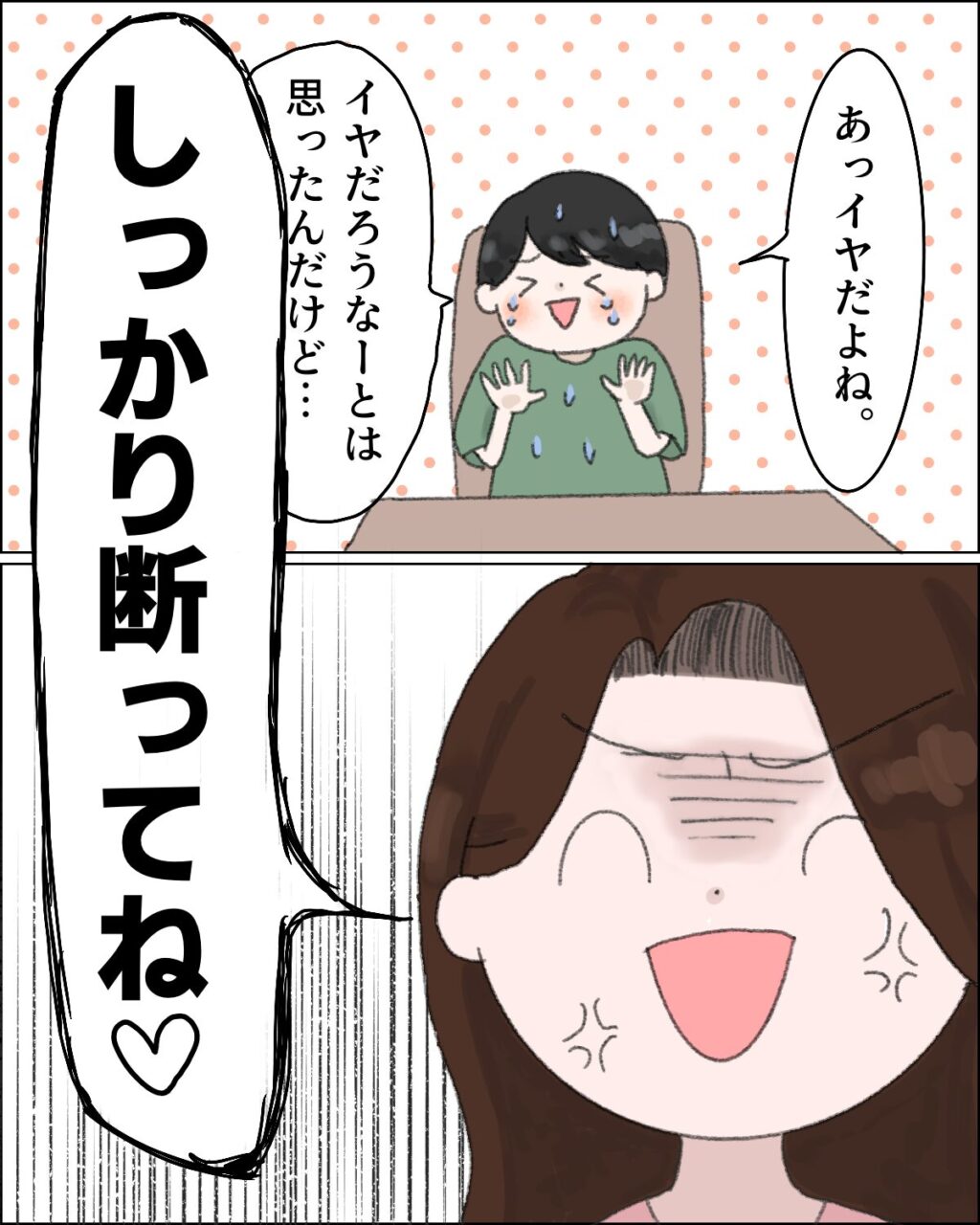 それを見て「あっイヤだよね。イヤだろうなーとは思ったんだけど・・」と慌てて言い出す良太に、「しっかり断ってね」と怒りはおさまらないまま、無理やり笑顔を作って言いました。