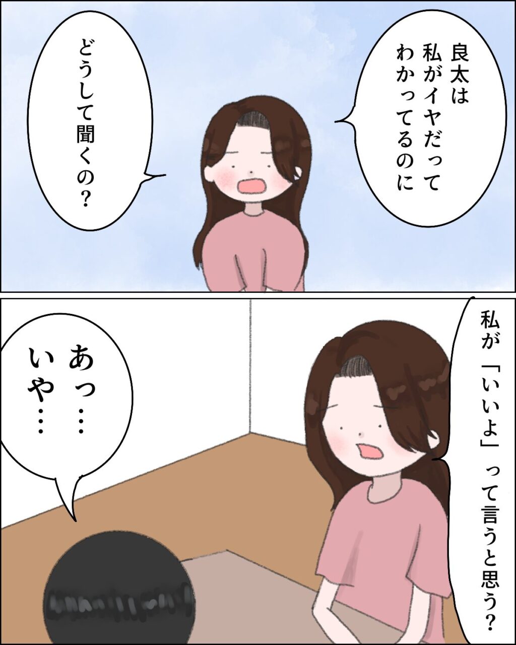 そんな良太に、「良太は私がイヤだってわかってるのに、どうして聞くの?私が『いいよ』って言うと思う?」と聞くと、「あっ・・いや・・」と答えにくそうな良太が、