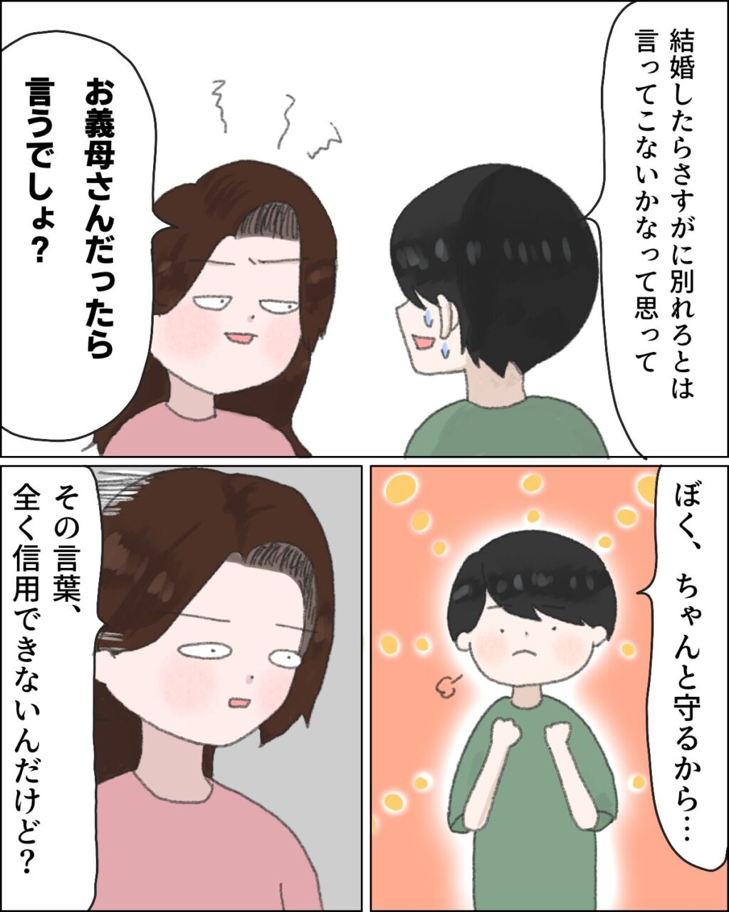 「結婚したらさすがに別れろとは言ってこないかなって思って」と楽観的なことを言う良太に「お義母さんだったら言うでしょ?」とすかさず突っ込む私。すると「ぼく、ちゃんと守るから・・」と意気込む良太ですが、これまでのことを振り返って「その言葉、全く信用できないんだけど?」と真顔で言いました。