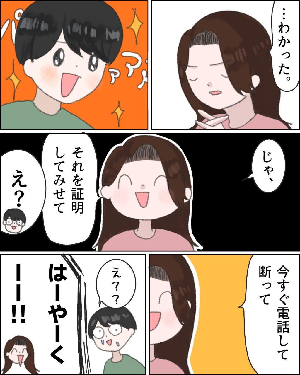 良太の決意を聞き「・・わかった」と私が言うと、パァァァっと一気に良太の表情が明るくなりました。ここで私はすかさず「じゃ、それを証明してみせて」とにっこり笑顔を浮かべながら言いました。「え?」と驚く良太に「今すぐ電話して断って」と畳みかける私。それでもまだ「え??」と言って動揺している良太に「はーやーくーー!!」と大きな声で言いました。