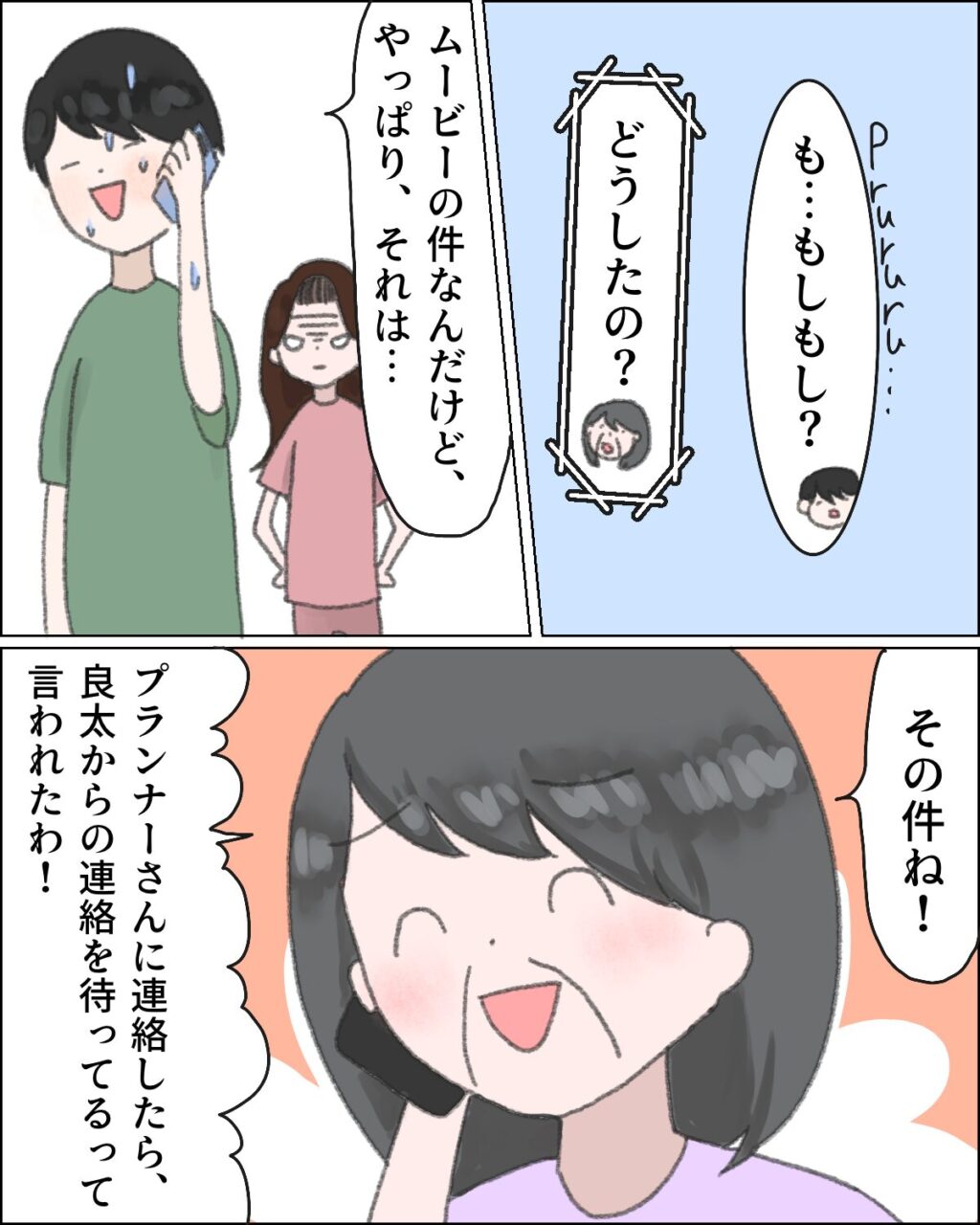 「も・・もしもし?」恐る恐る話し出す良太に「どうしたの?」と義母。「ムービーの件なんだけど、やっぱり、それは・・」と切り出すと、「その件ね!プランナーさんに連絡したら、良太からの連絡を待ってるって言われたわ!」と嬉しそうに言う義母。