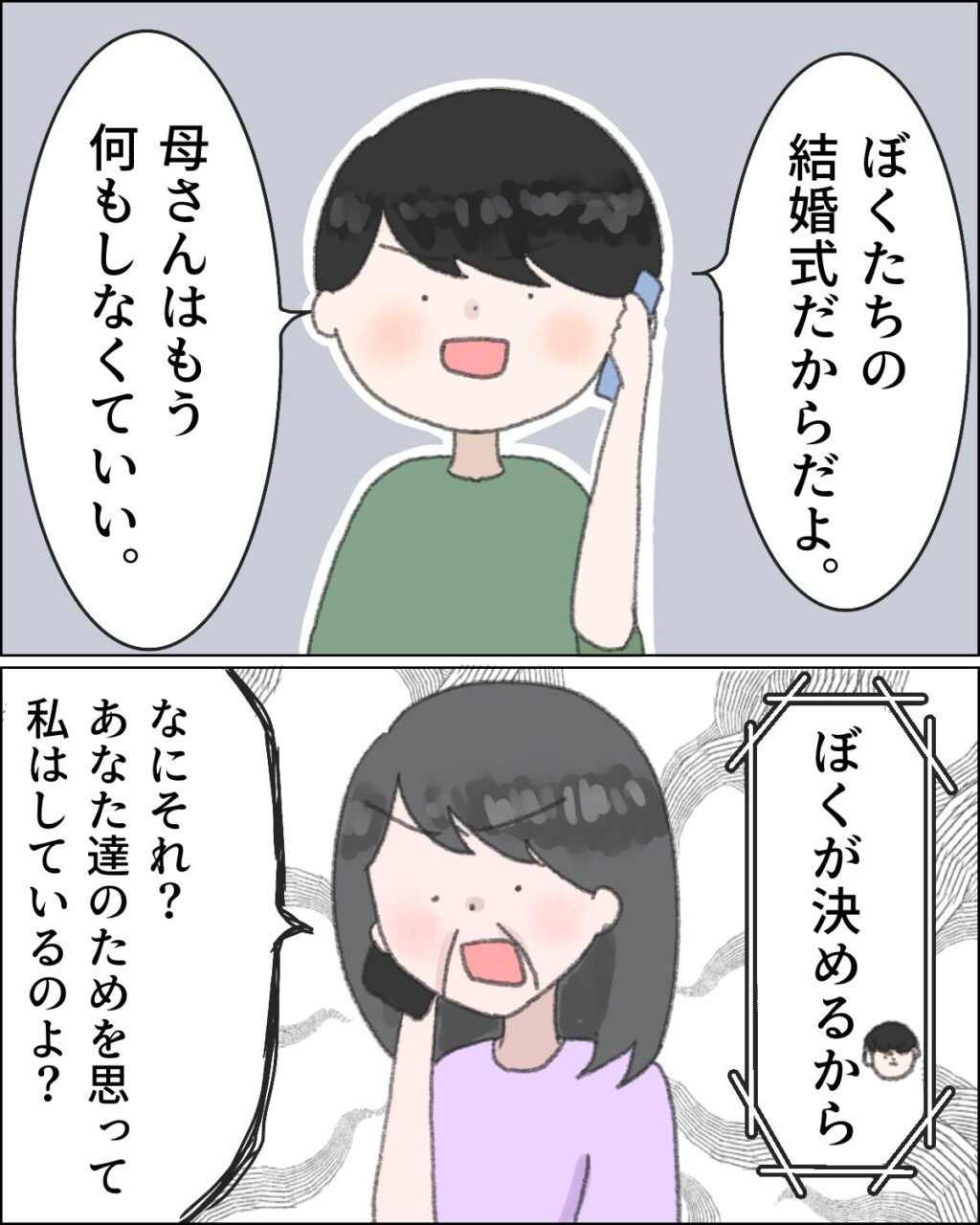 すると、「ぼくたちの結婚式だからだよ。母さんはもう何もしなくていい」と良太がきっぱり伝えます。「ぼくが決めるから」そう言い切る良太に、「なにそれ?あなた達のためを思って、私はしているのよ?」と平然と答える義母。
