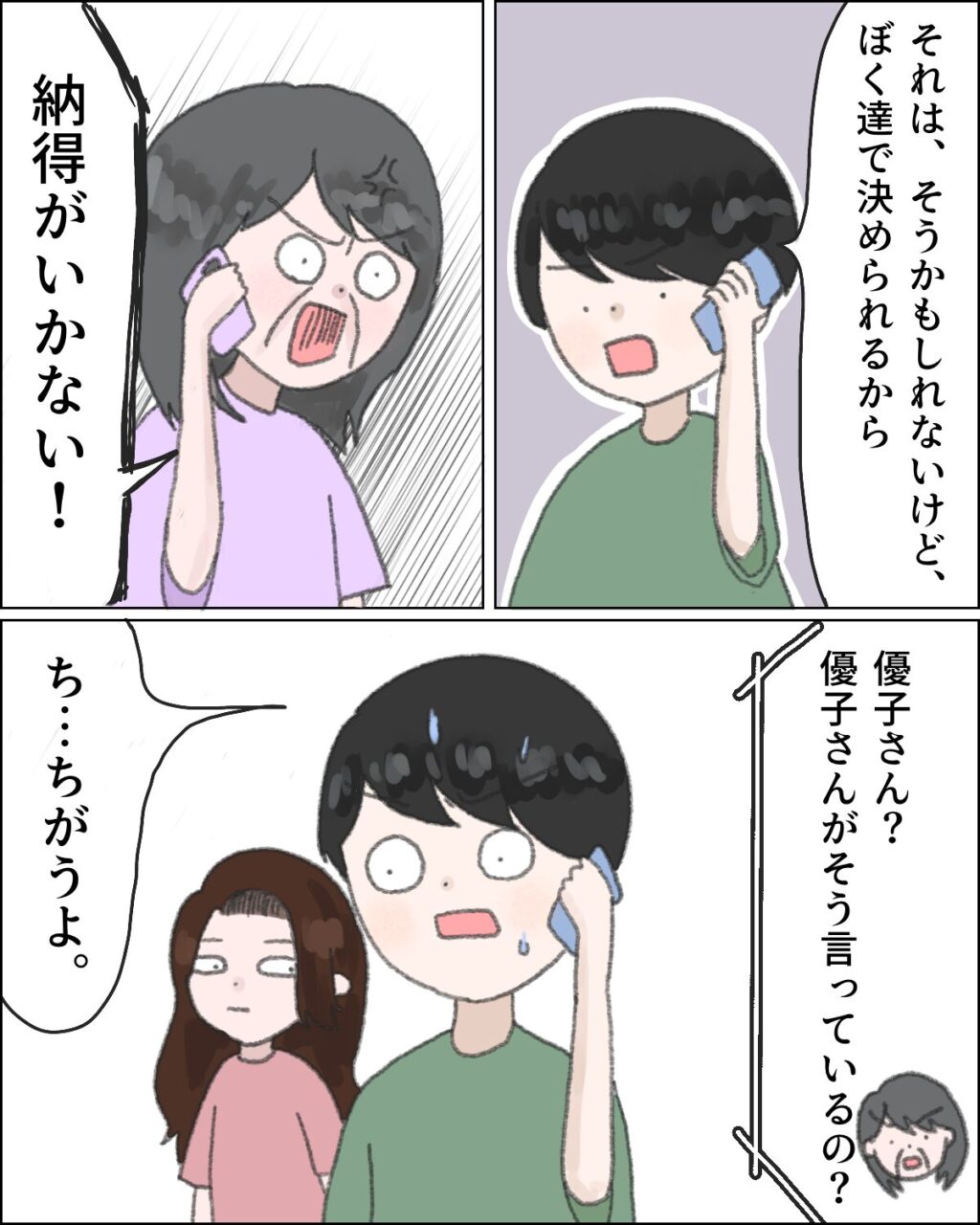 母親に結婚を反対されたら良太は自分と別れるつもりだったのだと思った私はショックを隠し切れず、「ごめん。ちょっと時間ちょうだい」と言いながら、「このまま結婚してもいいのかな」と迷いを感じました。すると「優子と別れるつもりはないよ」良太は言うものの、「母さんを止められないから・・」と頼りない言葉。最初から諦めモードの良太を厳しく追及すると、「ぼく、ちゃんと守るから」と意気込みを見せるも全く信用できず、「これから私に黙ってお義母さんの言う事聞かないって約束できる?」と確認し、「じゃ、それを証明してみせて」と、今すぐ義母に電話をしてプラン変更の件を断るよう詰め寄りました。