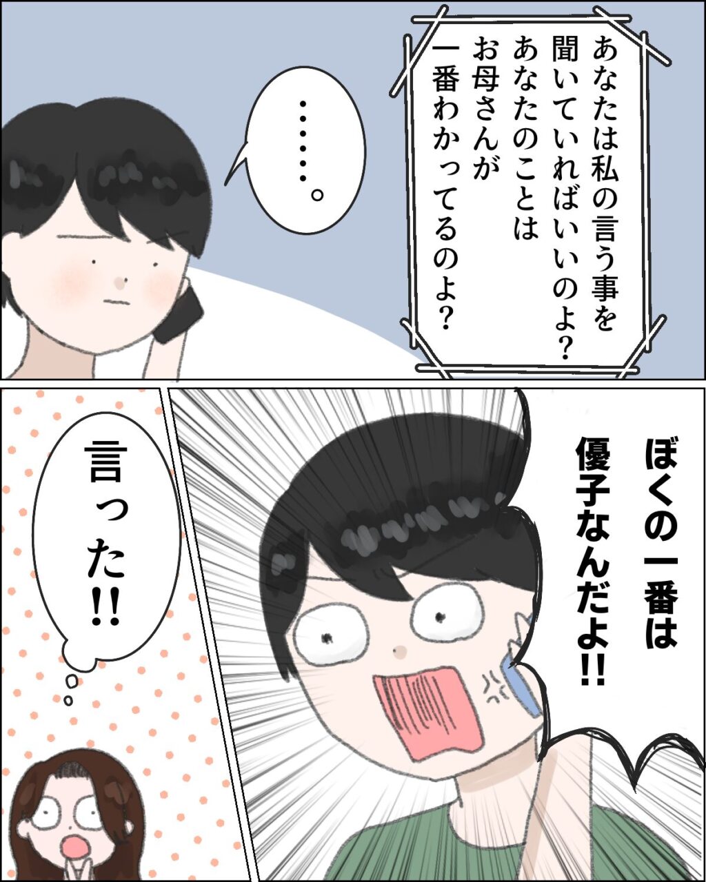 「あなたは私の言う事を聞いていればいいのよ?あなたのことはお母さんが一番わかってるのよ?」と語りかけるように言う義母の言葉を黙って聞いていた良太は、「ぼくの一番は優子なんだよ!!」と大きな声で言い、「言った!!」私はちょっぴり驚きながらその様子を見ていたのでした。