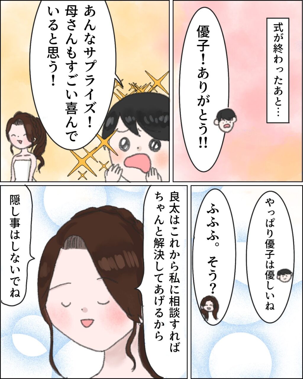 自分の気持ちよりも義母の希望を優先して結婚式でサプライズプレゼントをした優子さんのことを良太さんも義父も大絶賛。今回のことで良太さんから絶大な信頼を勝ち取った優子さんは「これから私に相談すればちゃんと解決してあげるから、隠し事はしないでね」と良太さんに話し、良太さんが義母の言いなりにならないように念押し。「うん!わかった!これからは何かあったら優子に聞くからね!」と目を輝かせる良太さんを見て優子さんは「ふふふふふ」と笑顔を浮かべます。義父から「ママもちゃんとお礼を言わないと!」と促されても黙り込む義母を見て「お礼を言われる為にやったわけじゃないですから~」と言う謙虚な優子さんの株はどんどん上がっていきます。良太さんにも義父にももてはやされる優子さんを見て義母はとっても悔しそう。