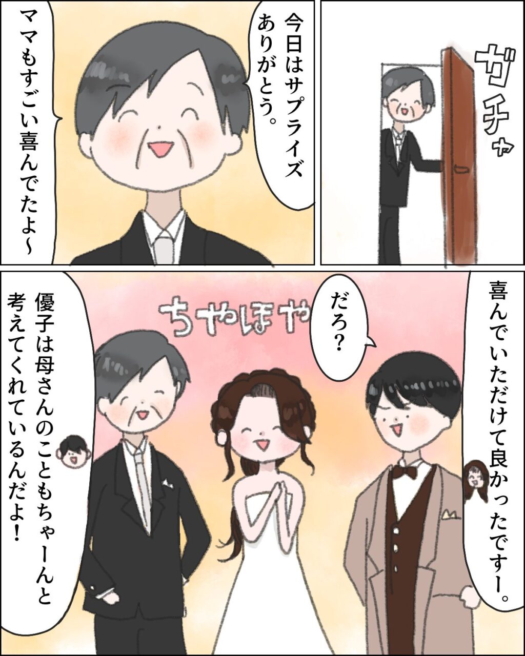 そこへ義父がやってきました。「今日はサプライズありがとう。ママもすごい喜んでたよ~」と嬉しそうに感謝を伝えてくれた義父に、「喜んでいただけて良かったですー」と謙虚な姿勢をみせる私。そんな私を見て「だろ?優子は母さんのこともちゃーんと考えてくれているんだよ!」と得意気に義父に話す良太。