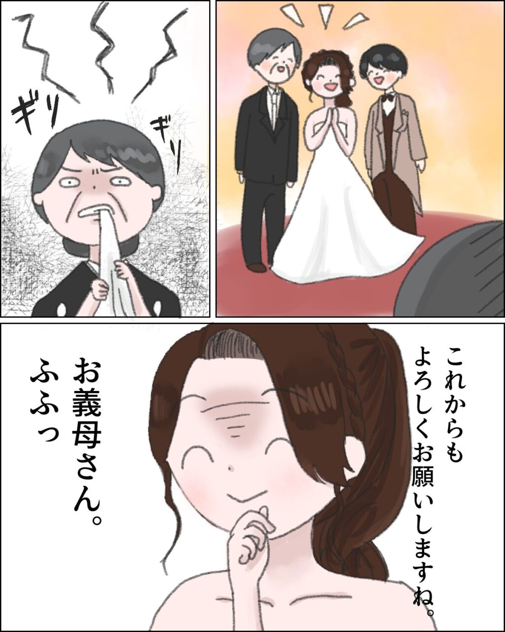 良太からも義父からももてはやされる私を見て、義母はとっても悔しそう。そんな義母に「これからもよろしくお願いしますね。お義母さん」とこっそり不敵な笑みを浮かべた私でした。あ~スッキリした!
