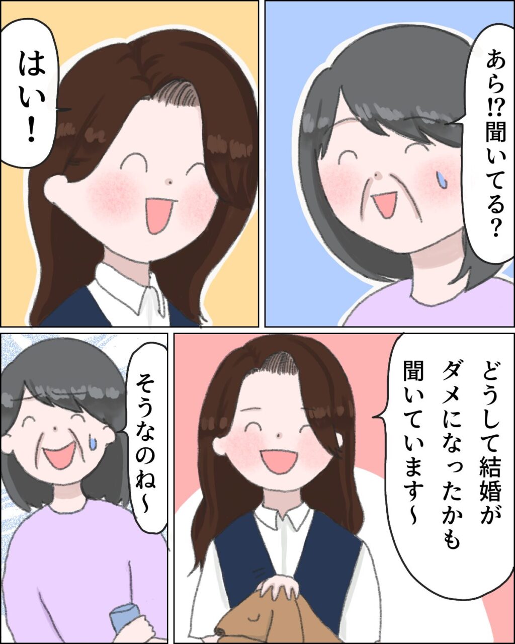 「あら!?聞いてる?」驚く義母に、「はい!」と元気いっぱいに返事をする私。「どうして結婚がダメになったかも聞いています~」と言うと、「そうなのね~」と動揺している義母。