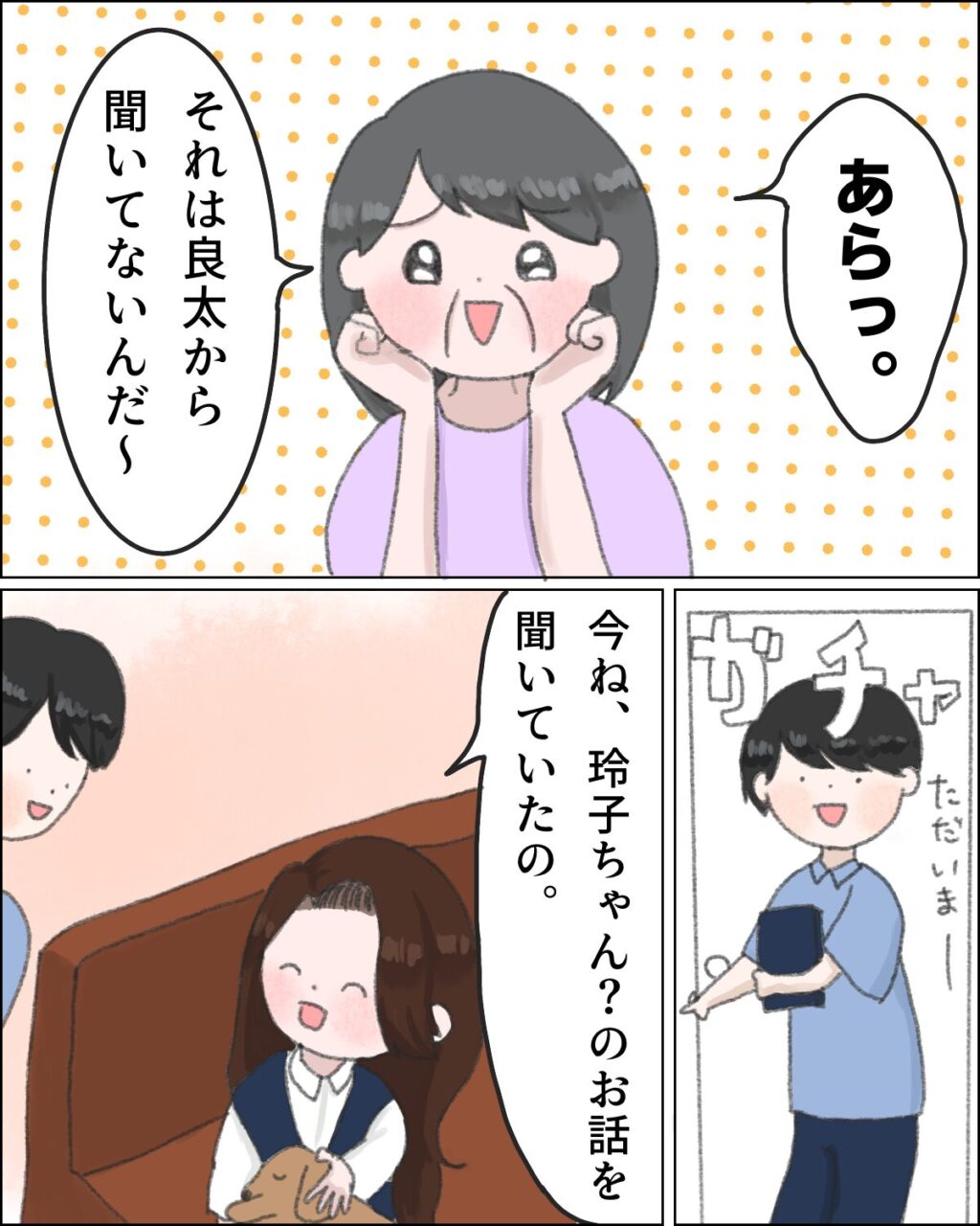 「あらっ。それは良太から聞いてないんだ~」と勝ち誇ったように言う義母。そこへ「ただいま~」とアルバムを抱えて戻ってきた良太に、「今ね、玲子ちゃん?のお話を聞いていたの」と言うと、