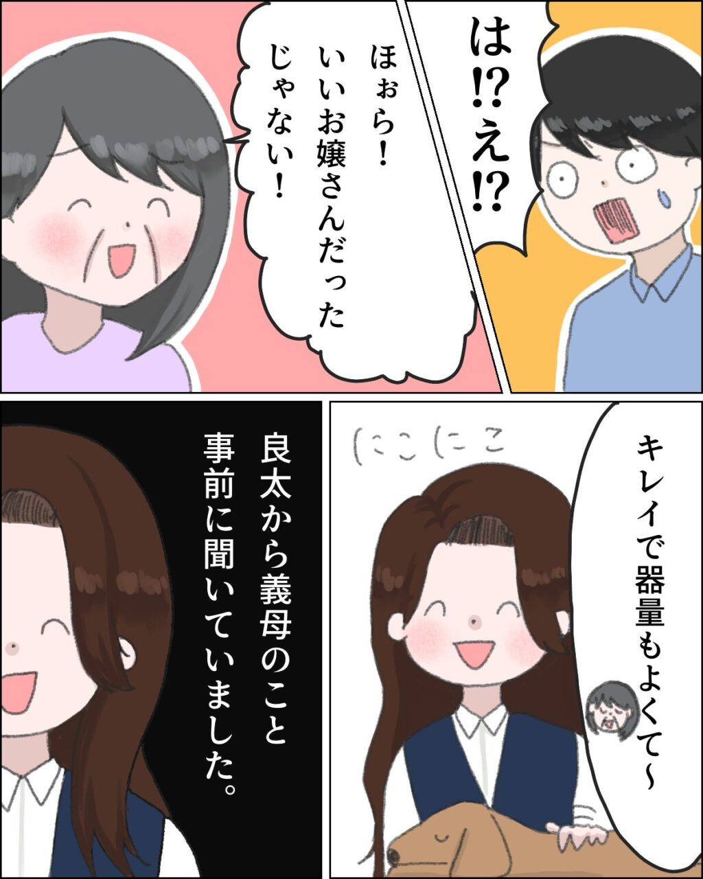 「元カノと結婚の話も出ていた」と義母に言われ、冷静に「あっ!美奈ちゃんのことですか?良太さんから聞いてます~」と言った優子さん。動揺した義母に、「どうして結婚がダメになったかも聞いてます~」と言うと、「じ・・じゃ、玲子ちゃんのことは?」と言う義母。「玲子ちゃん?」と不思議そうに言うと、勝ち誇ったように「あらっ。それは良太から聞いてないんだ~」と嬉しそうに言いました。そこへ良太が戻ってきて、「玲子ちゃん?の話を聞いていたの」と優子さんに言われ驚く良太さん。義母がうれしそうに玲子ちゃんの話を続けるなか、「自分には優しくていい母だけど、ちょっと癖が強い。元カノと別れるキッカケも母が原因」と、優子さんは、事前に良太さんから聞いて知っていたのです。