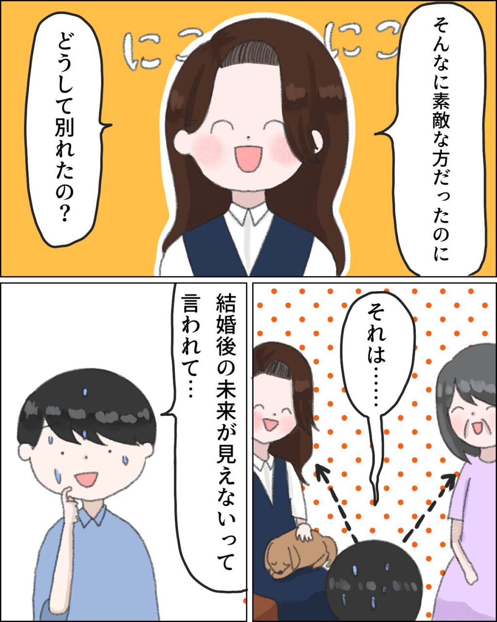 「そんなに素敵な方だったのにどうして別れたの?」とニコニコしながらそう言うと、「それは・・」と困りながら、「結婚後の未来が見えないって言われて・・」と言葉に詰まりながら言いました。