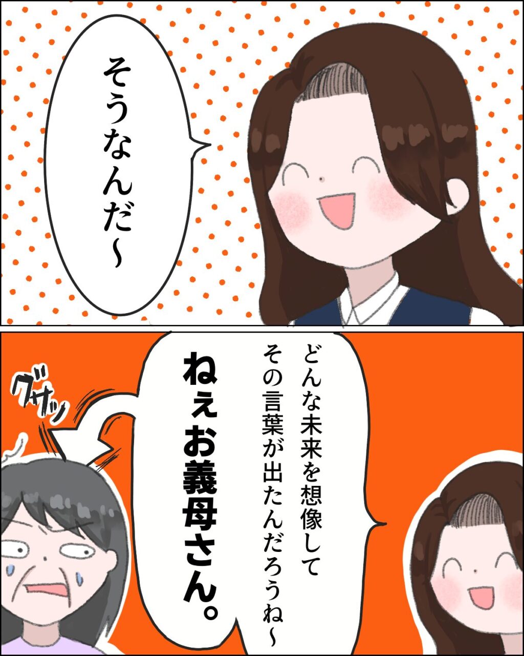 良太の言葉に「そうなんだ~」と答えた私。「どんな未来を想像してその言葉が出たんだろうね~。ねぇお義母さん」と義母に直接刃を!