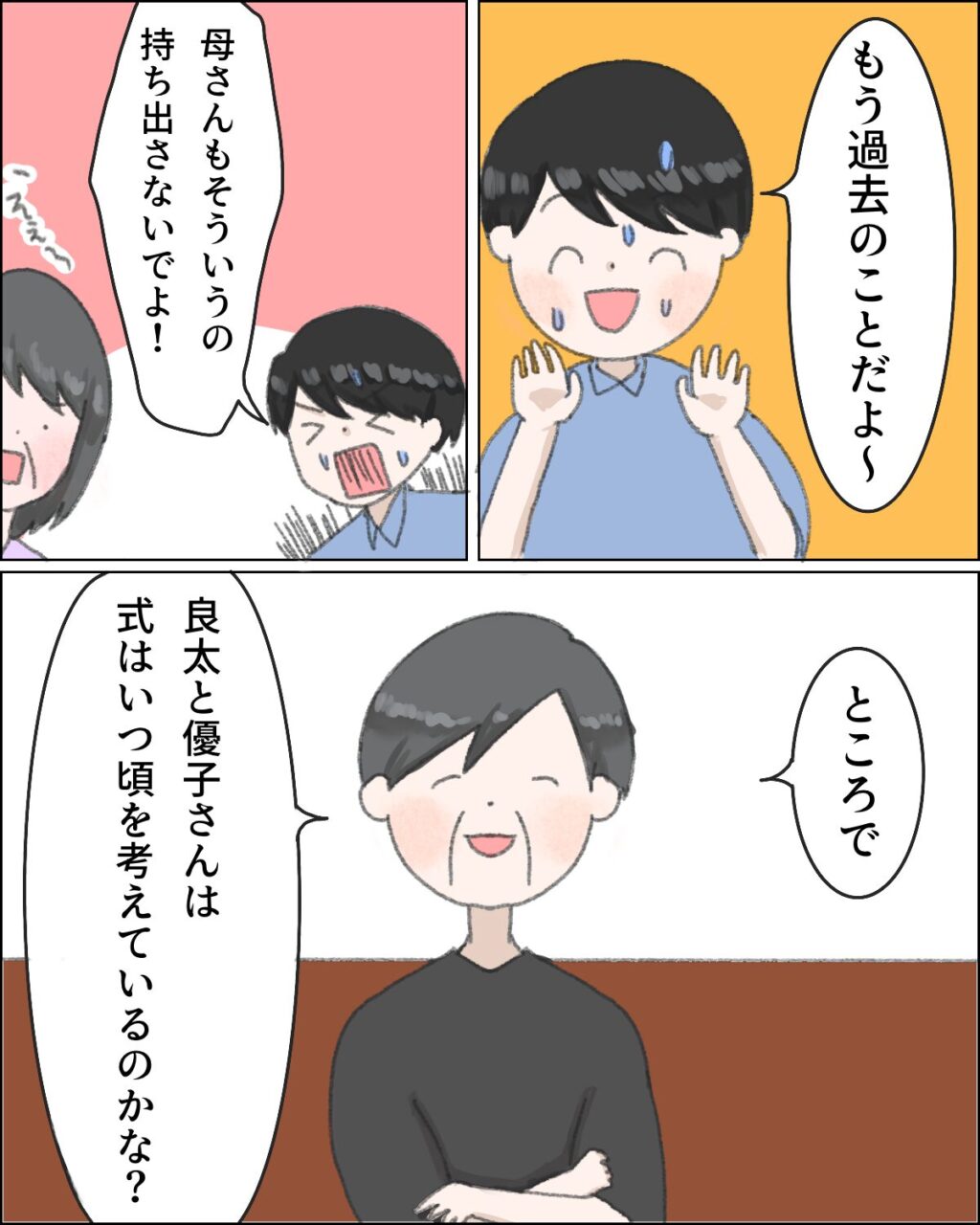 「もう過去のことだよ~」と焦りながら、「母さんもそういうの持ち出さないでよ!」と文句を言うと、「ところで、良太と優子さんは、式はいつ頃を考えているのかな?」これまでのやりとりを静かに聞いていた義父が言いました。