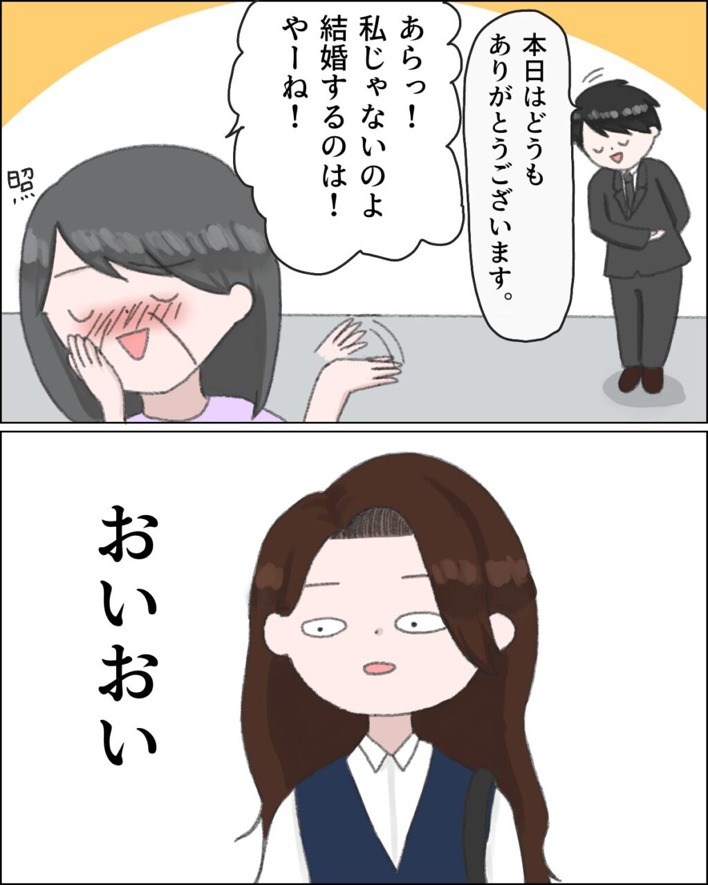 そして、「本日はどうもありがとうございます」式場の担当者が挨拶すると、「あらっ!私じゃないのよ。結婚するのは!やーね!」と頬を赤くしながら突っ込む義母を見て、「おいおい」と思わず呟く私。