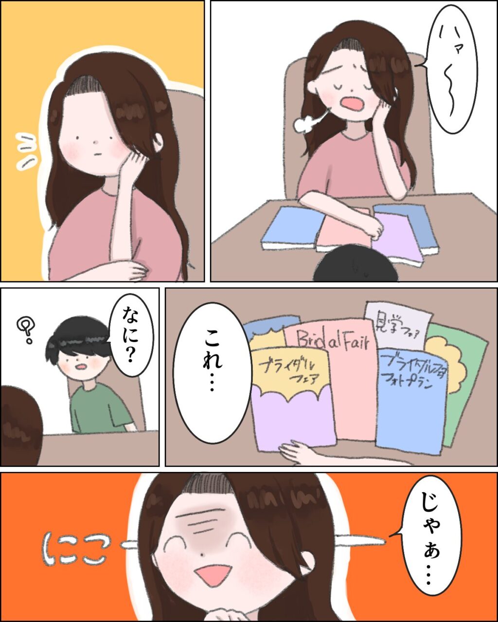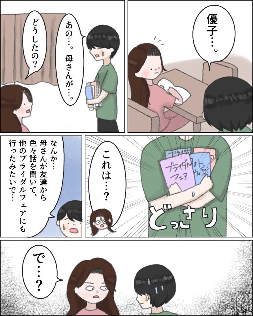 ある日、「母さんが・・」と言いながら優子さんが渡されたのは、山盛りのブライダルフェアパンフレット!義母が友達から色々話を聞いて、他のブライダルフェアに行ったらしく、「優子に渡してって」と言われたと聞き、「うん。いらない」と即答。その後、良太さんに詰め寄りながら、「渡してってじゃないのに・・いらないって言って欲しいのよ」と心の中で呟くも良太さんには聞こえず。その後、テーブルに広げられたパンフレットを見ていると、「これ・・じゃぁ・・」と何かに気づき、「にこ~」としながら良太さんに言いました。