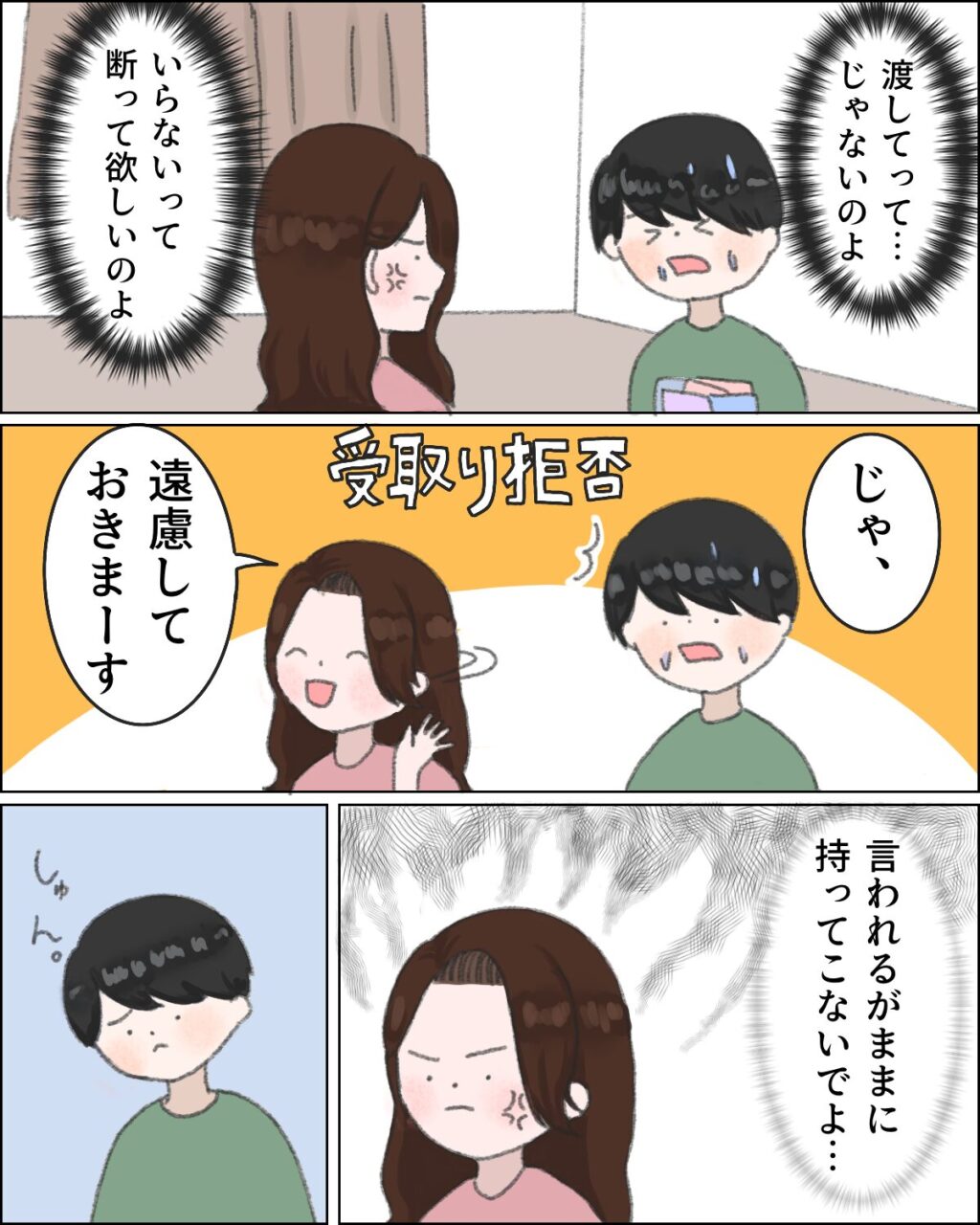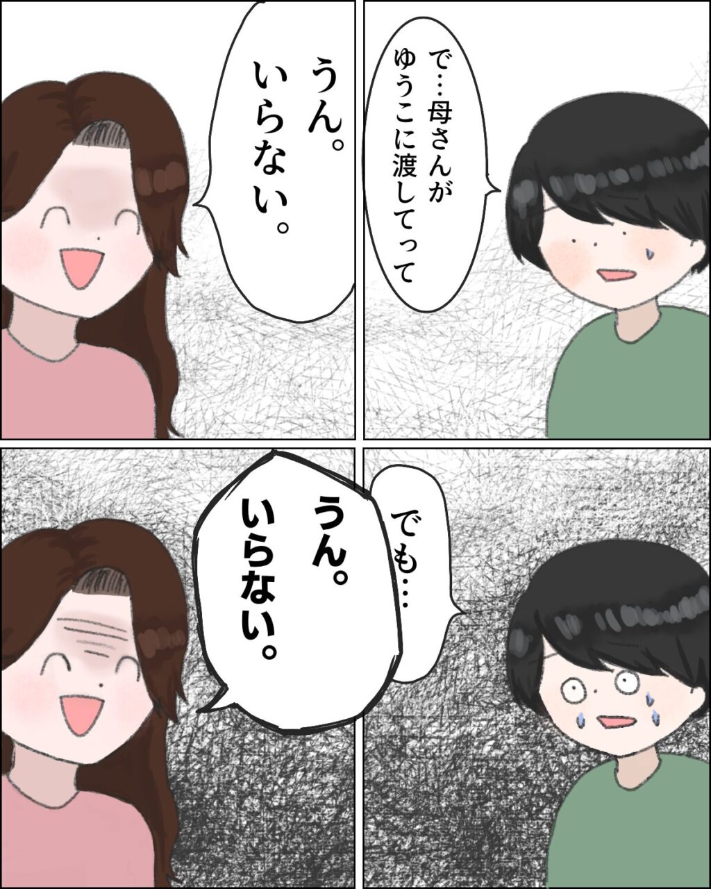 「で・・母さんが優子に渡してって」良太の言葉に「うん。いらない」と即答すると、「でも・・」と動揺する良太。間髪入れずに「うん。いらない」と繰り返しました。