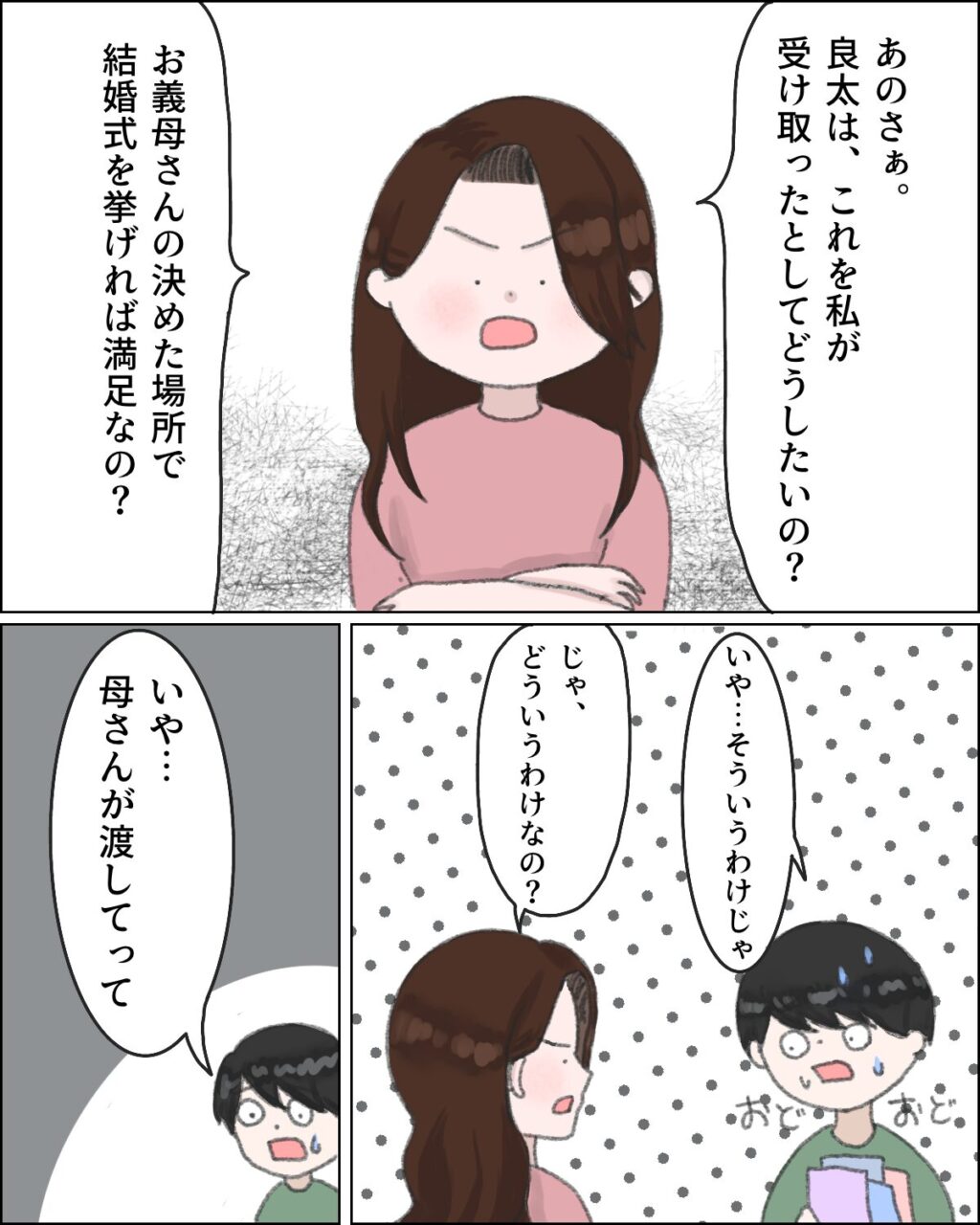 そして、「あのさぁ。良太は、これを私が受け取ったとしてどうしたいの?お義母さんの決めた場所で、結婚式を挙げれば満足なの?」と聞くと、「いや・・そういうわけじゃ・・」とおどおどしながら答える良太に、「じゃ、どういうわけなの?」と聞き返すと、「いや・・母さんが渡してって」と良太が答えました。