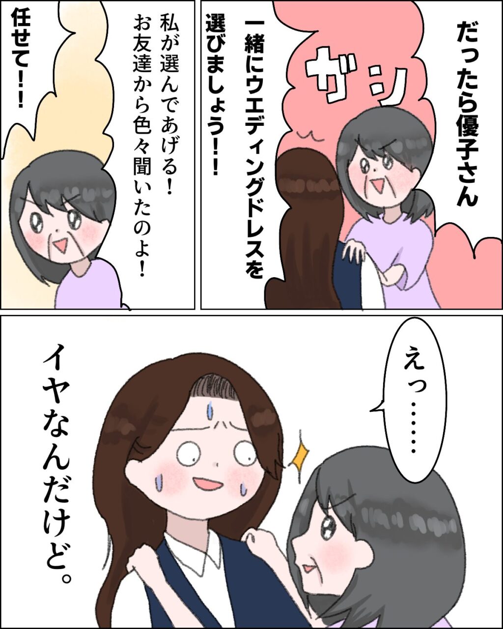 そう言った後、「だったら優子さん!一緒にウエディングドレスを選びましょう!!私が選んであげる!お友達から色々聞いたのよ!任せて!!」とやる気に満ち溢れた義母の顔を見て・・「えっ・・イヤなんだけど」と心の中で呟く私。
