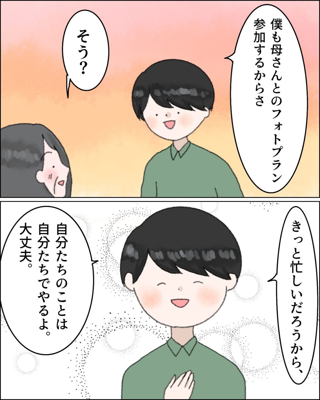 そして、「僕も母さんとのフォトプラン参加するからさ」良太の言葉に「そう?」と義母がうれしそうに言うと、「きっと忙しいだろうから、自分たちのことは自分たちでやるよ。大丈夫」と天使の笑顔で言う良太。