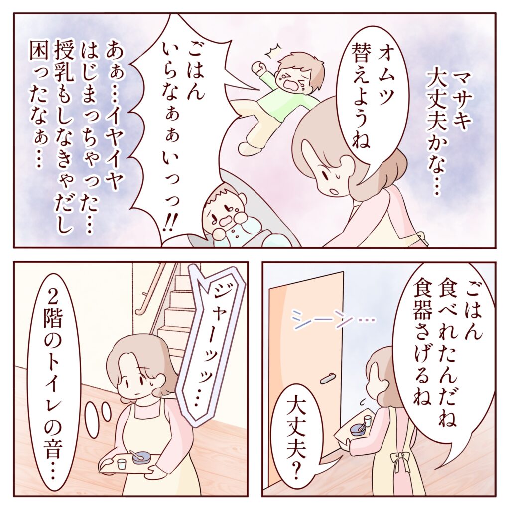 当時、2歳と0歳の息子たちは当然手がかかります。マサキを心配しながらも、オムツ交換や、授乳、そして上の子のイヤイヤ期に構っていたのでマサキの寝ている部屋に何度も行くことができませんでした。それでも食器をさげに行くと、ドアの前に完食して置いてあったので「ご飯食べれたんだね、大丈夫?」と声をかけましたが返事はありませんでした。それでも2階のトイレを使う音が聞こえていたので動けてはいるな、とは確認していました。