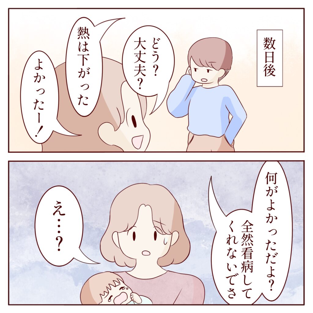 そんな感じで過ごした数日後、マサキが起きてきたので「どう?大丈夫?」と声をかけると、不機嫌そうに「熱は下がった」と言われましたが「よかったー!」と言うと「何がよかっただよ?全然看病してくれないでさ」と文句を言うマサキに「え・・・?」と引いてしまいました。