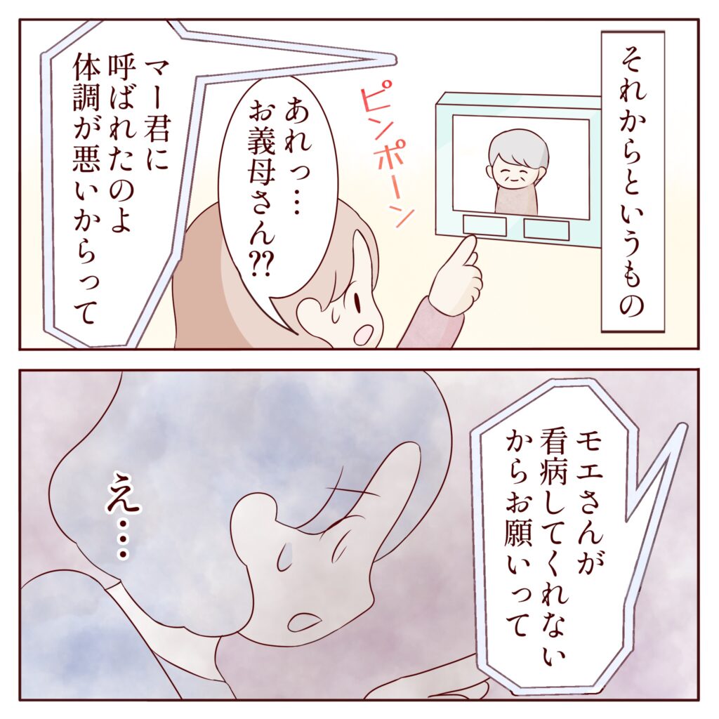 それからと言うもの、マサキは体調が悪くなると私には一切言わず、直接義母を呼ぶようになりました。初めて義母が看病に来た時は、「マー君に呼ばれたのよ、体調が悪いからって。モエさんが看病してくれないからお願いって。」と言われて驚きとショックで固まってしまいました。