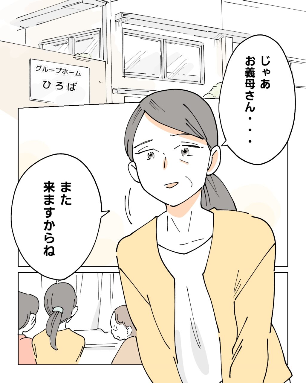 グループホームで生活する義母を訪問するのが私の日課です。この日も義母の様子を見に来ていましたが、最近は調子の悪い日が多くてお話することができませんが、ただ静かに座っている義母に夫や私の近況、ご近所さんのお話などを伝えています。わかっているのかいないのか、義母は目を閉じてじっとしています。しばらくして、そろそろ帰ろうと「じゃあお義母さん、また来ますからね」と立ち上がりました。