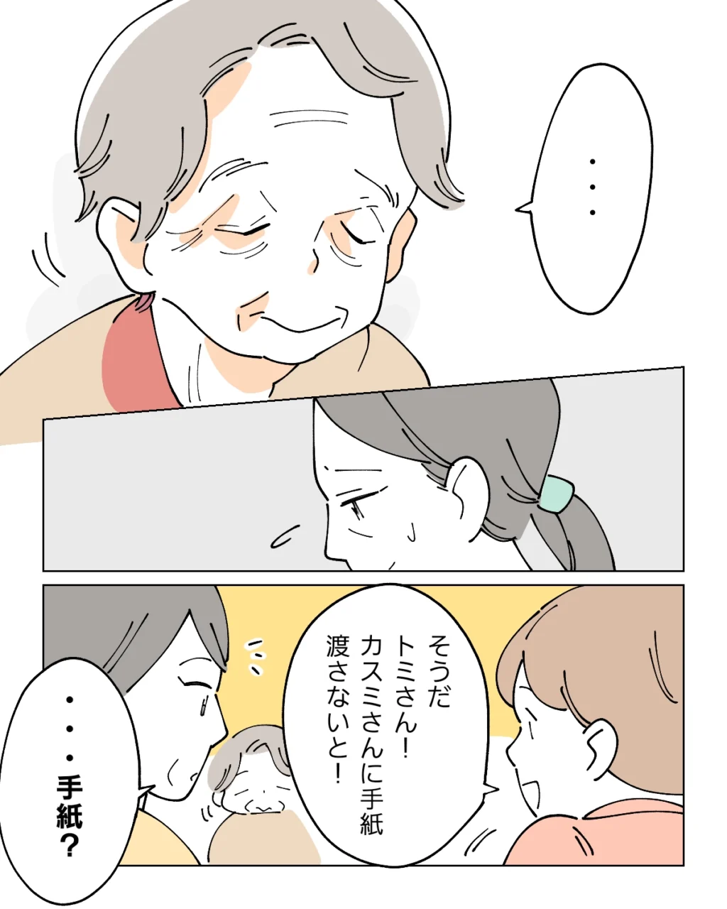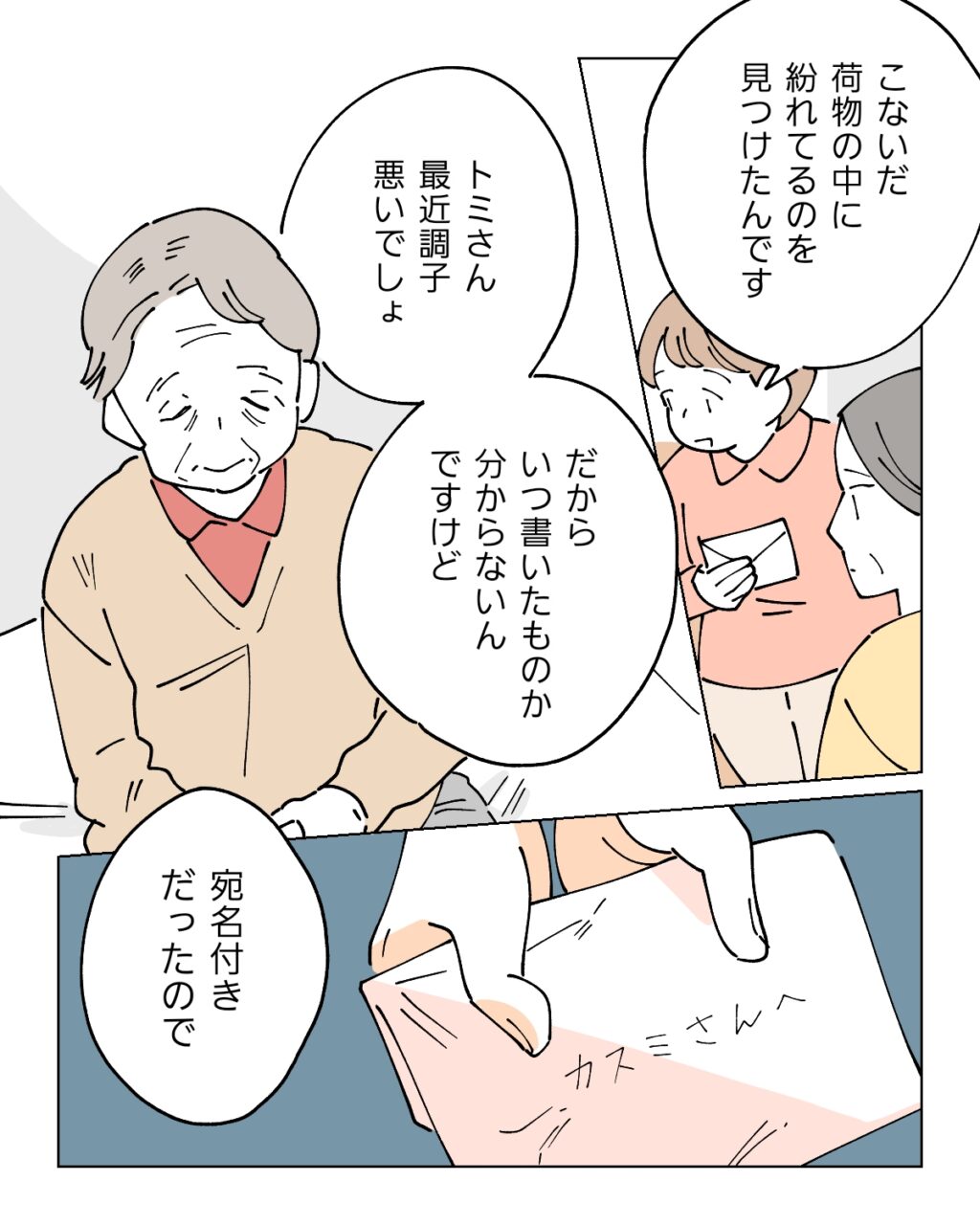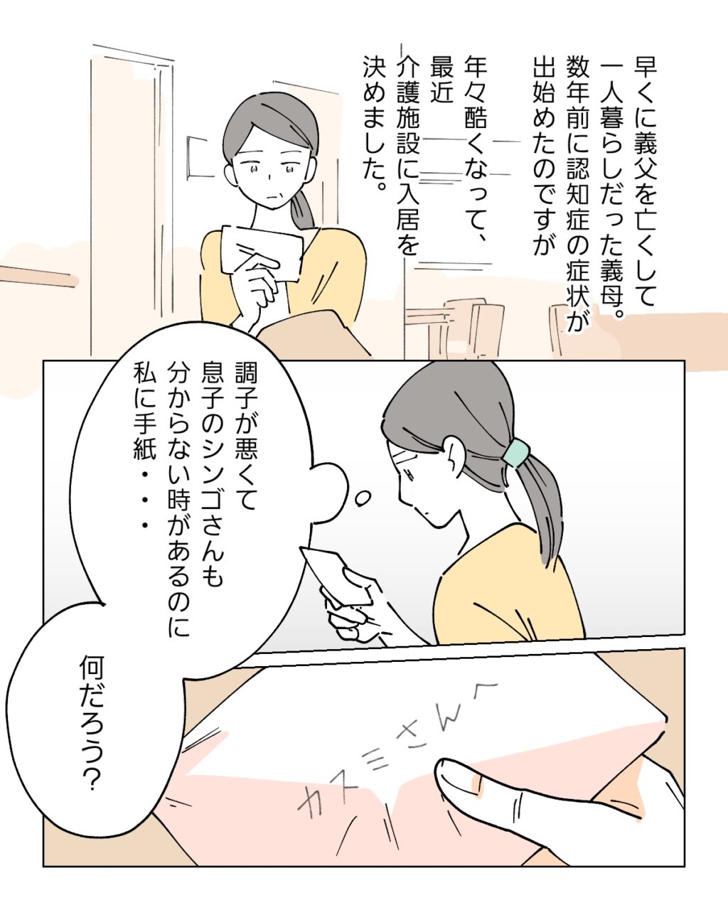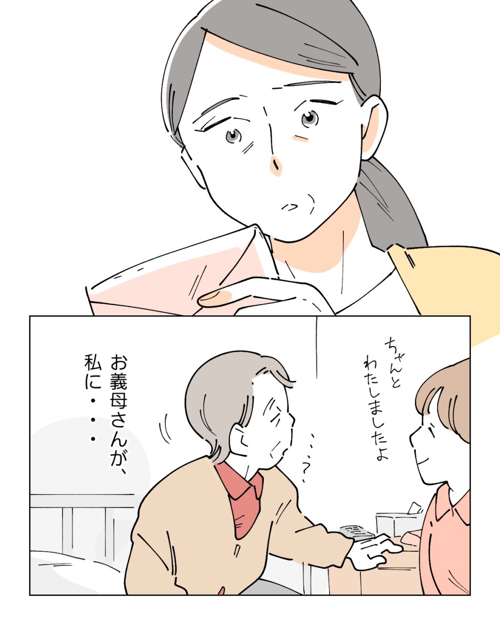 スタッフさんに「ちゃんと渡しましたよ」と声をかけられても良くわかっていない様子の義母が、私に手紙?なぜ?不思議な気持ちになりました。