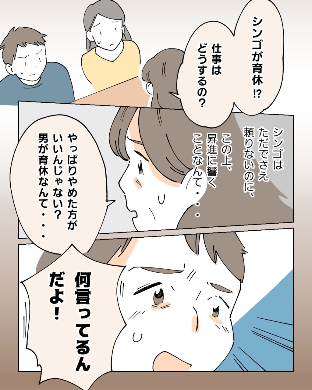 それからしばらくして、私の妊娠が分かった頃。私だけでなく、シンゴも育休を取ると知った義母は「やっぱりやめた方がいいんじゃない?男が育休なんて・・・」と、ただでさえ頼りないと思っているシンゴが、昇給に響くような選択をすることを、ひどく心配している様子でした。するとシンゴが「何言ってるんだよ!」と声を荒げます。