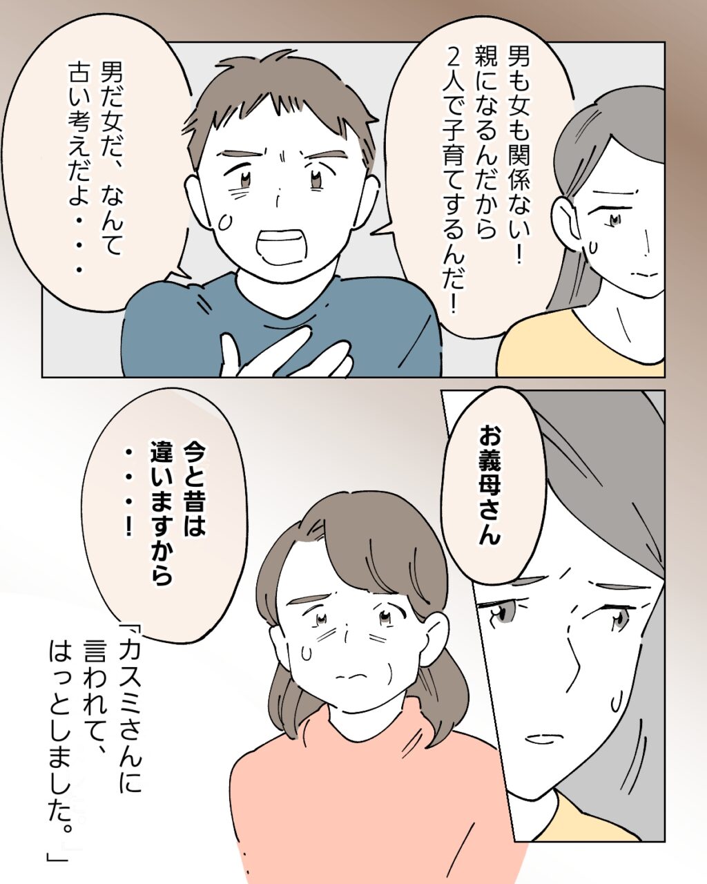 シンゴは義母の目をまっすぐ見つめると「男も女も関係ない!親になるんだから2人で子育てするんだ!男だ女だなんて、古い考えだよ」と力強く言い切りました。私もこの時は口にするべきか一瞬迷いましたが、意を決して「お義母さん、今と昔は違いますから!」と、はっきり自分の気持ちを伝えました。