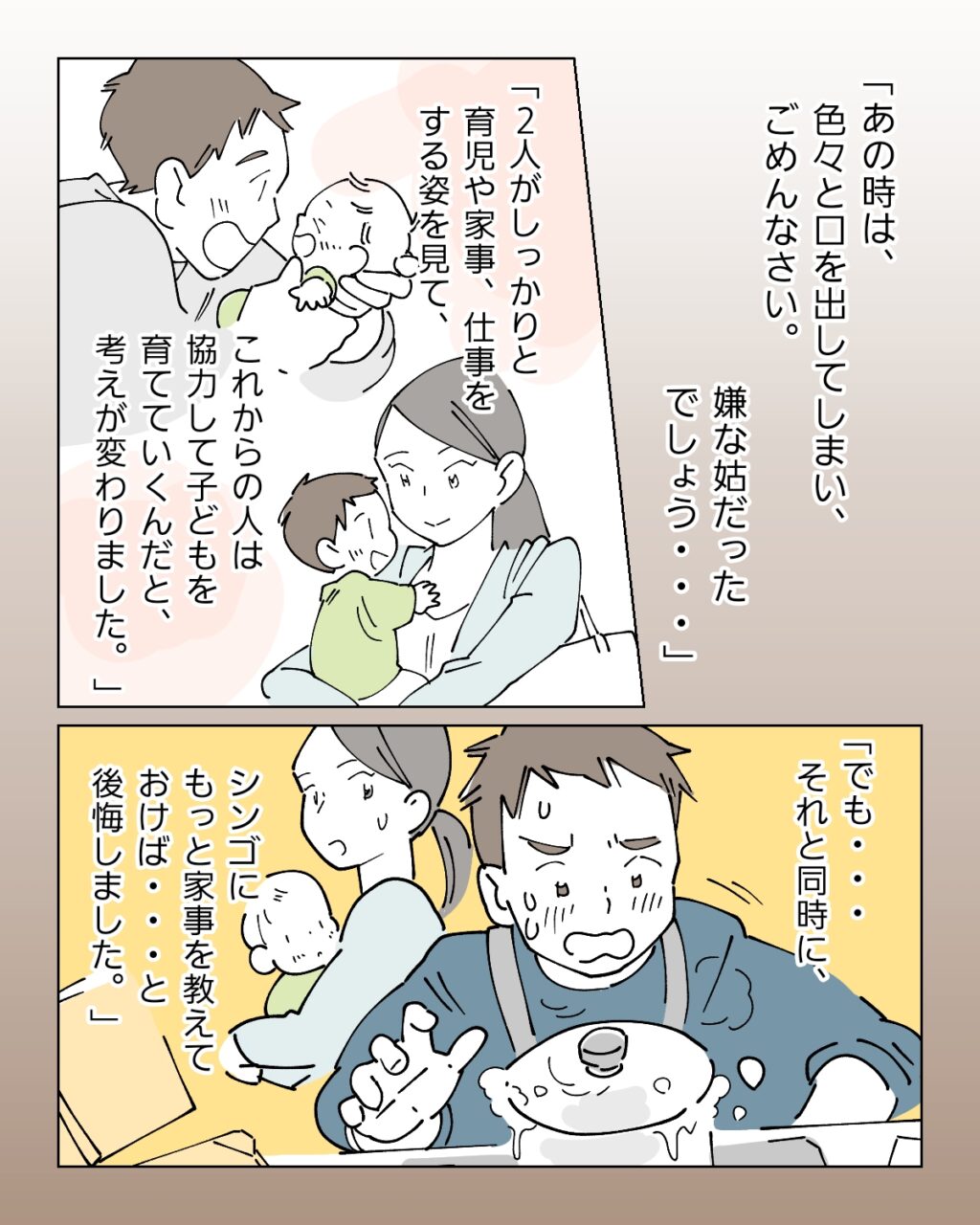 義母からの手紙には、[カスミさんに言われてはっとしました。あの時は色々と口を出してしまいごめんなさい。嫌な姑だったでしょう。2人がしっかりと育児や家事、仕事をする姿を見て、これからの人は協力して子どもを育てていくんだと考えが変わりました。でもそれと同時に、シンゴにもっと家事を教えておけば・・・と後悔しました。]と綴られていました。