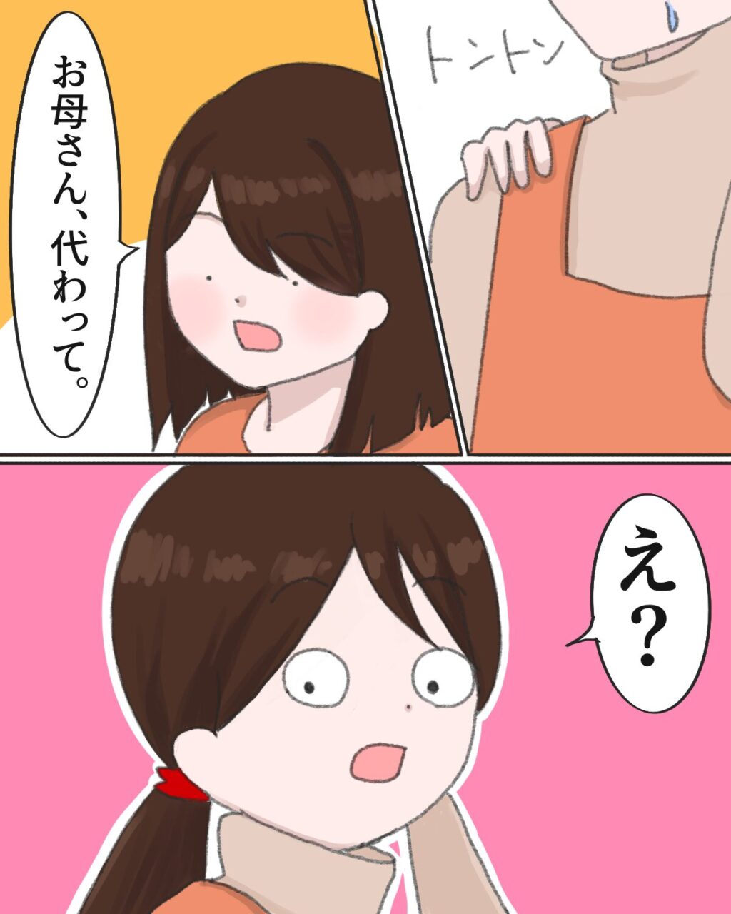 義母に返す言葉が見つからずにいると、いつのまにかそばに来ていた長女みかがトントンと私の方をたたき「お母さん、代わって。」と予想外のことを言ってきたので驚きました。