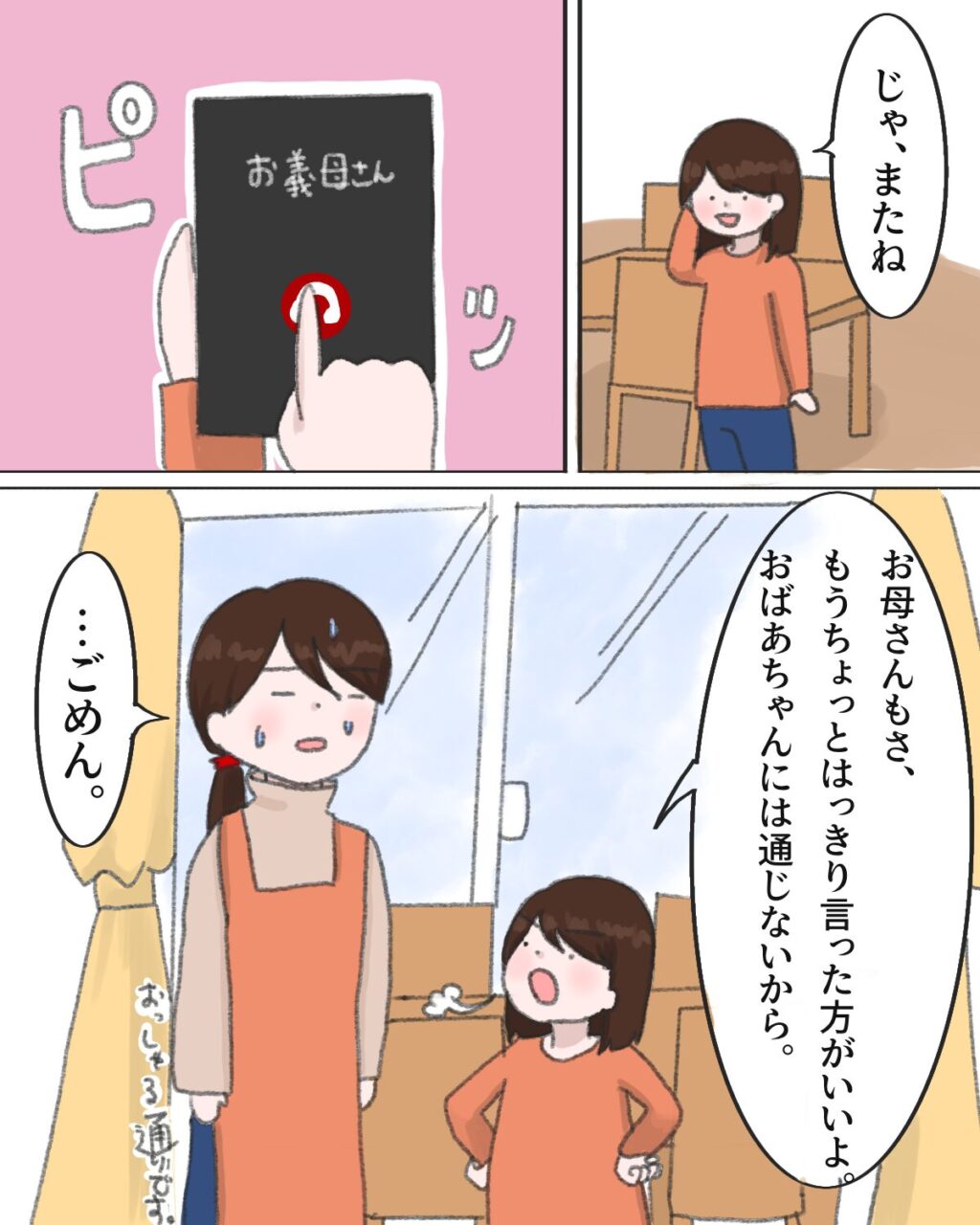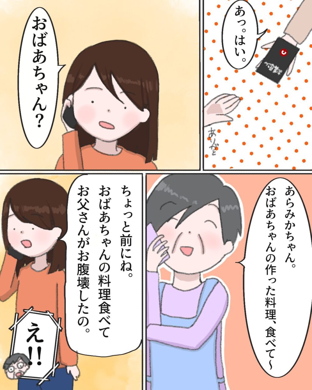 スマホを受け取ると、「おばあちゃん?」と話し始めたみか。「あら、みかちゃん。おばあちゃんの作った料理、食べて~」と、義母は思いがけず電話に出てきた孫に嬉しそうに伝えました。ところがみかは「ちょっと前にね。おばあちゃんの料理食べてお父さんがお腹壊したの。」と唐突に伝え出したので義母は「え!!」と驚きです。夫が腹痛になったのは私の体調管理ができていないせいだと思っていたからです。