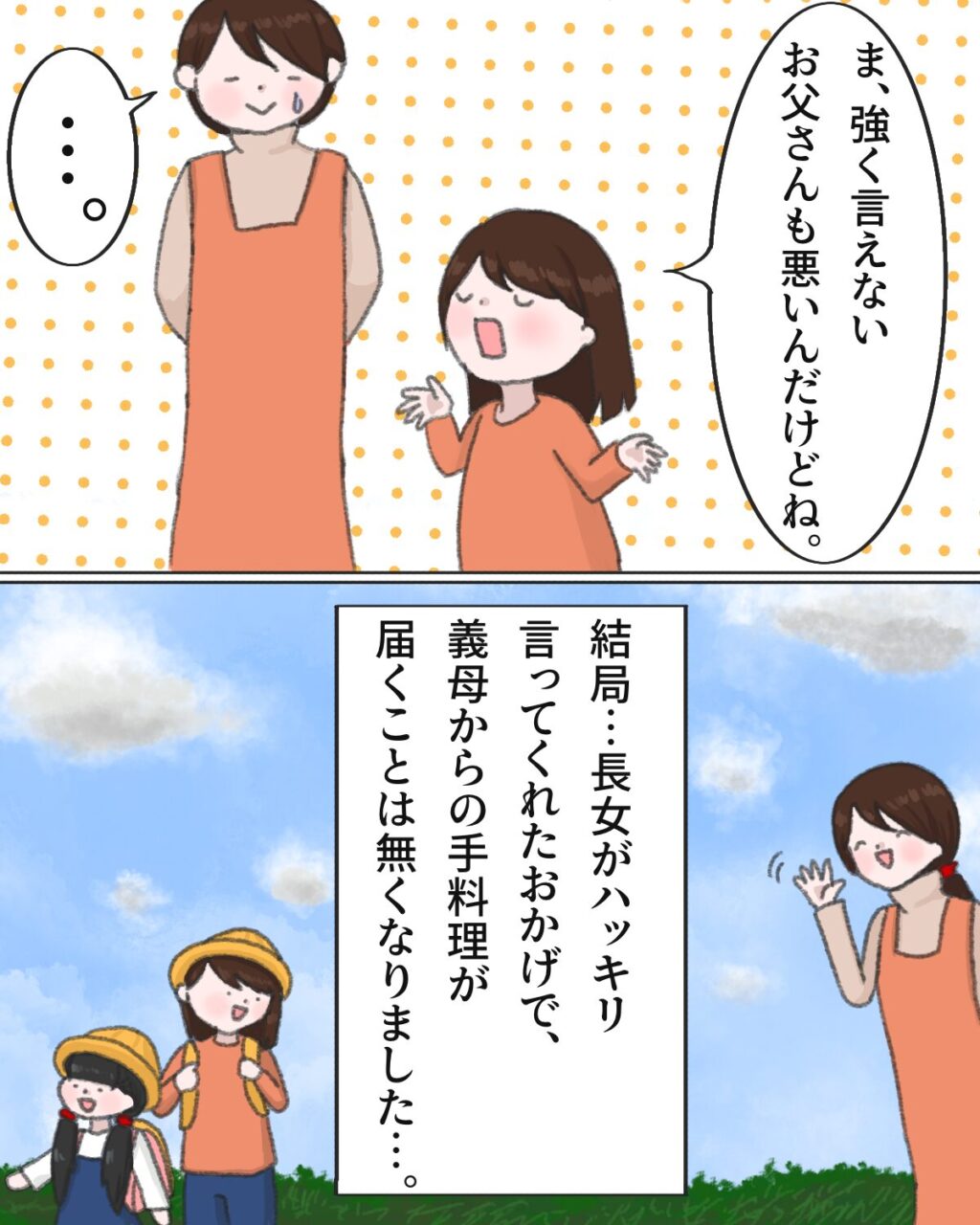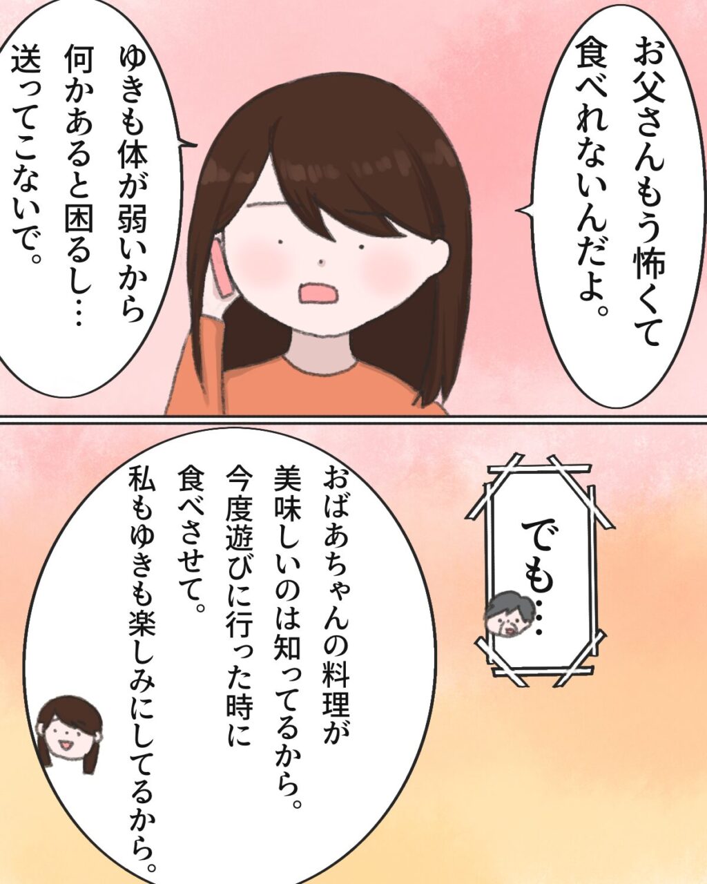「お父さん、もう怖くて食べれないんだよ。ゆきも体が弱いから何かあると困るし・・・もう送ってこないで。」みかは包み隠さずズバッと伝えました。そして「でも・・・」とまだ納得いかない様子の義母に、「おばあちゃんの料理が美味しいのは知ってるから。今度遊びに行った時に食べさせて。私もゆきも楽しみにしてるから。」と言いました。